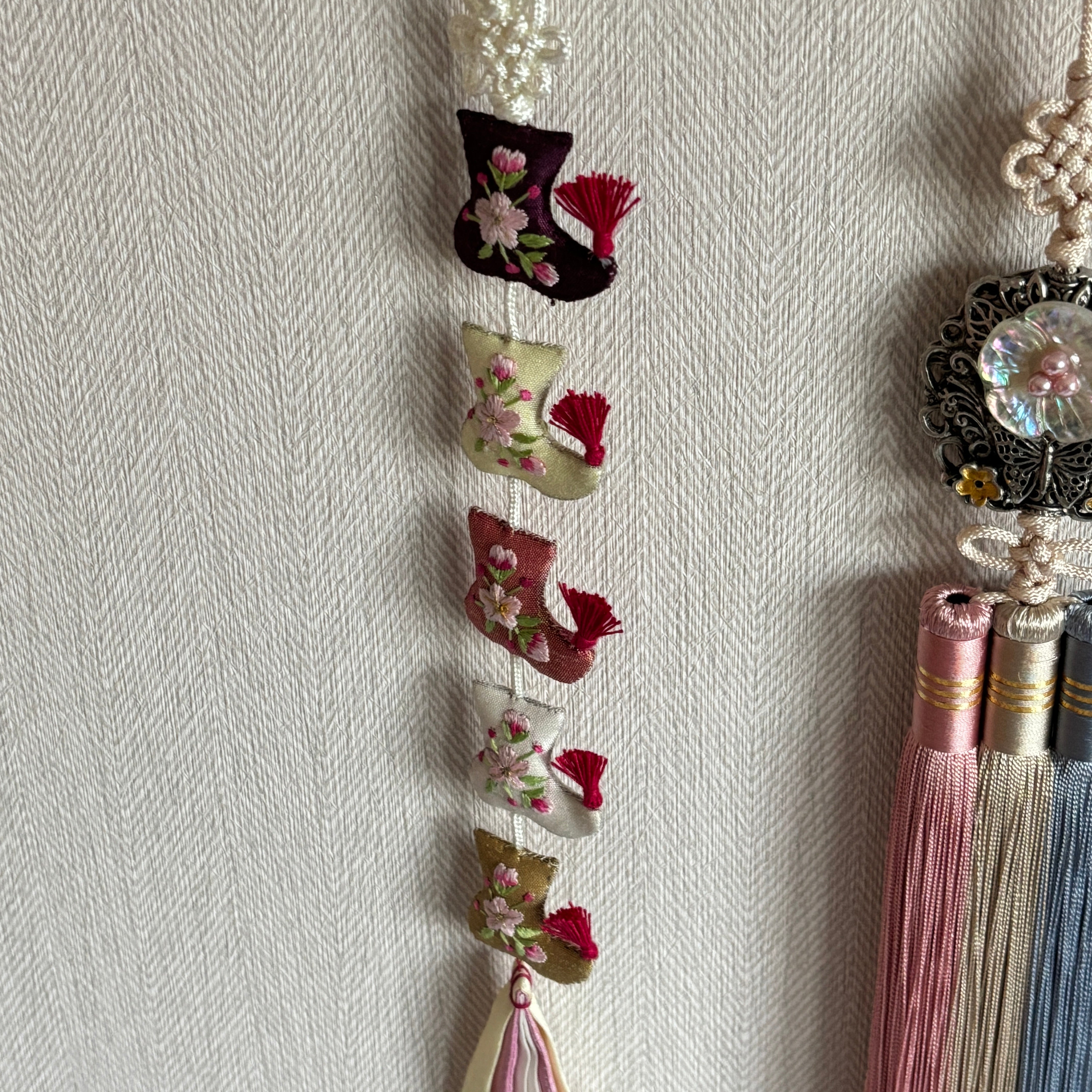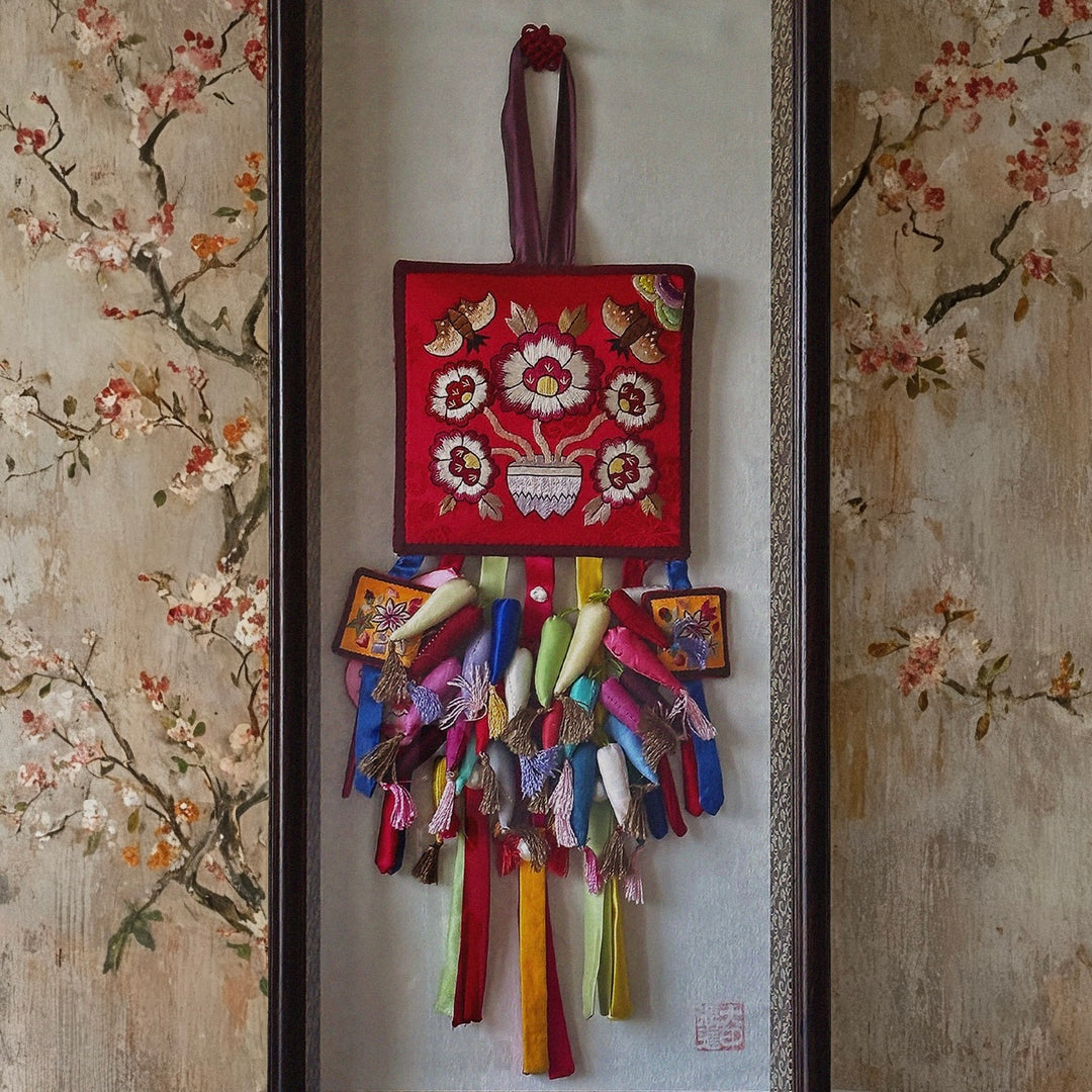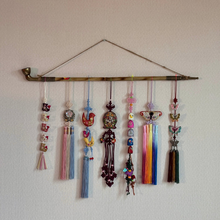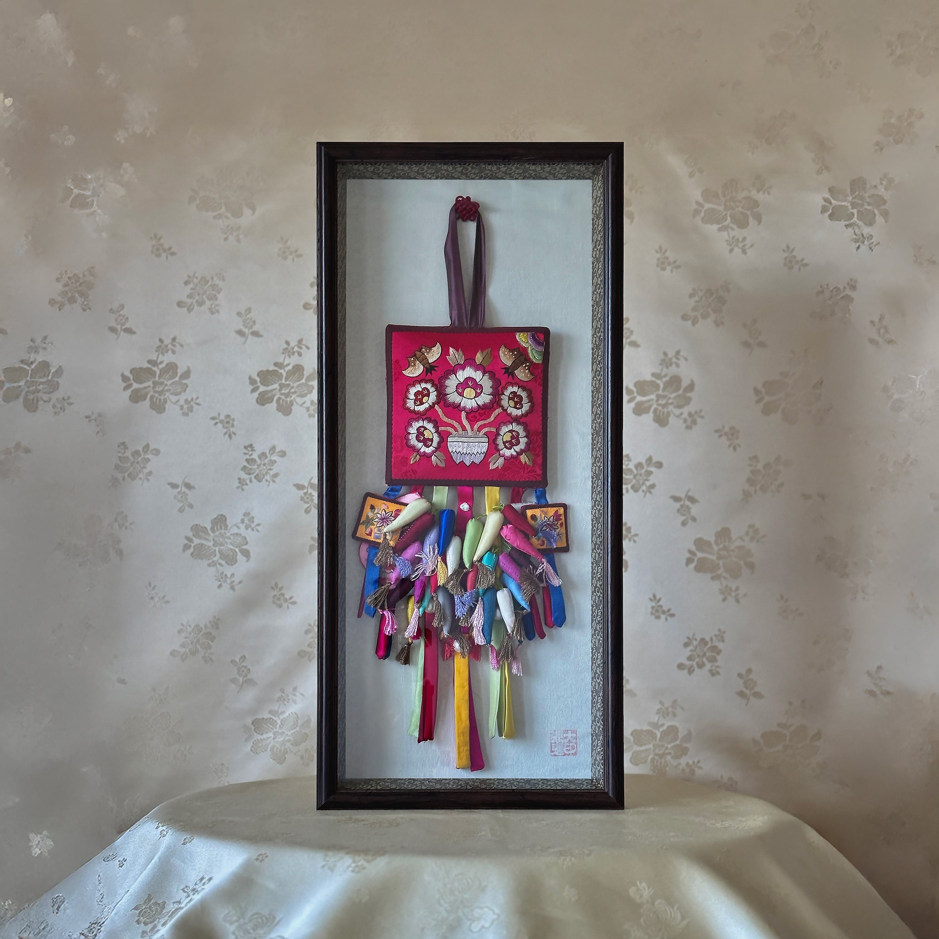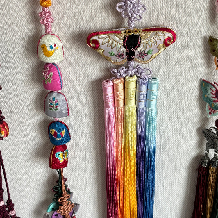 Norigae is a typical, traditional Korean accessory that is hung from a woman’s jeogori goreum (coat strings) or hanbok chima (skirt) and so on.