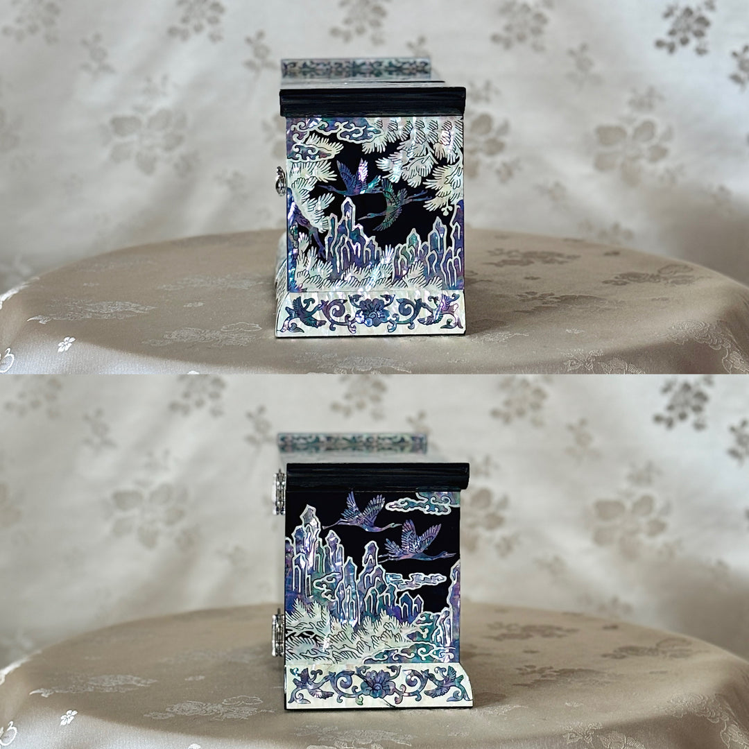 The design features a harmonious scene of pines, cranes, clouds, and mountains, symbolizing longevity, peace, and prosperity in Korean culture. Cranes are revered as auspicious creatures, while the pine tree represents resilience and steadfastness. This jewelry box encapsulates these meanings, offering not only a functional storage piece but also a daily reminder of nature’s beauty and life’s blessings.