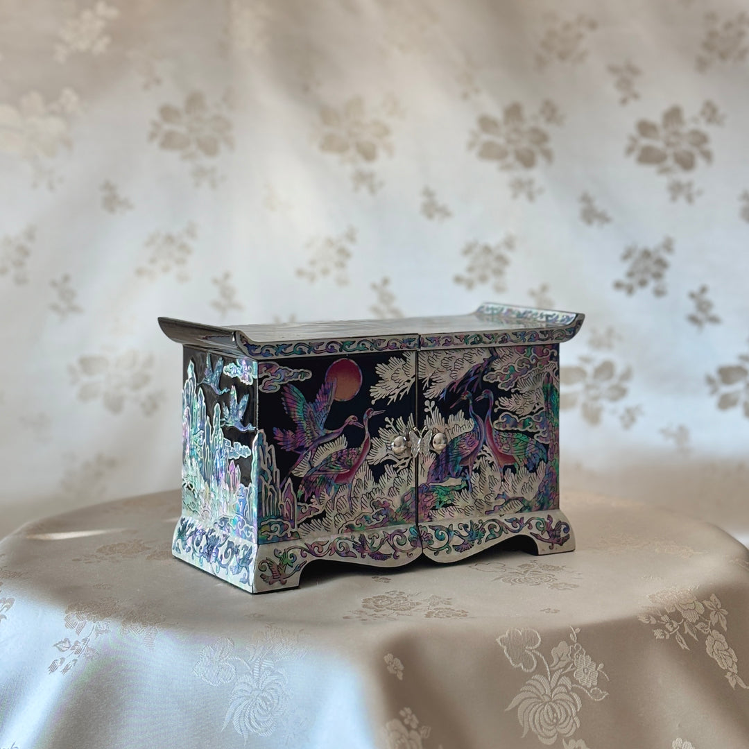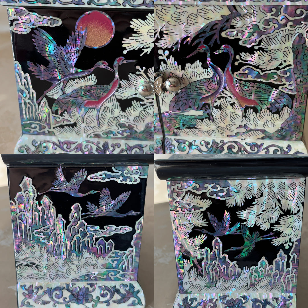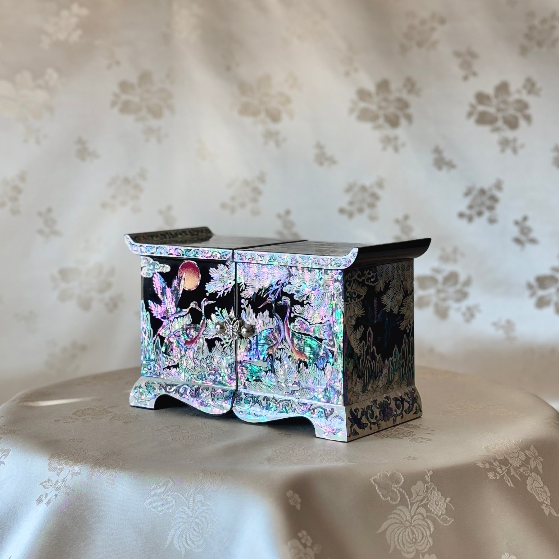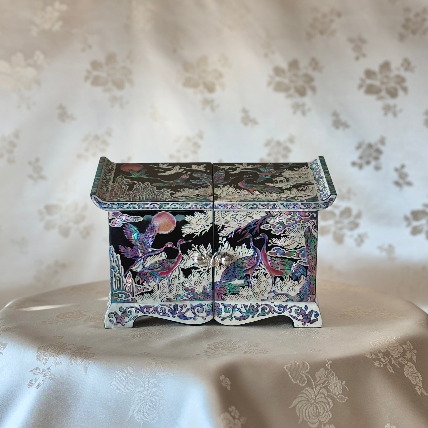 This Limited Luxurious Korean Traditional Handmade Mother of Pearl Jewelry Box celebrates the harmony of nature and elegance with its intricate pine and crane design. The hand-inlaid mother-of-pearl shimmers with iridescent hues, showcasing the artistry and dedication of skilled Korean craftsmen. With its unique shape and design, this jewelry box embodies both tradition and sophistication, making it an heirloom-worthy piece.