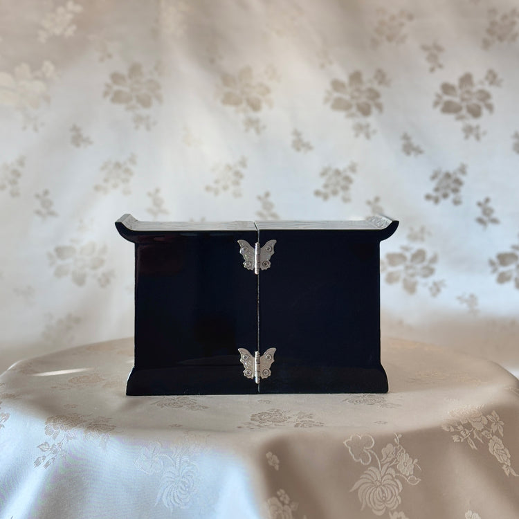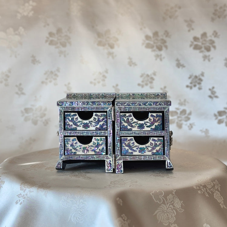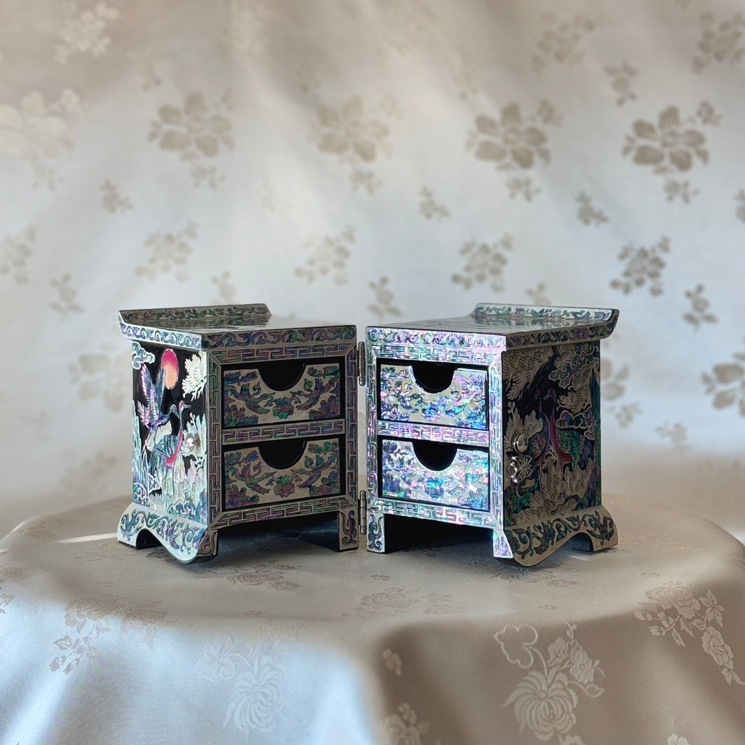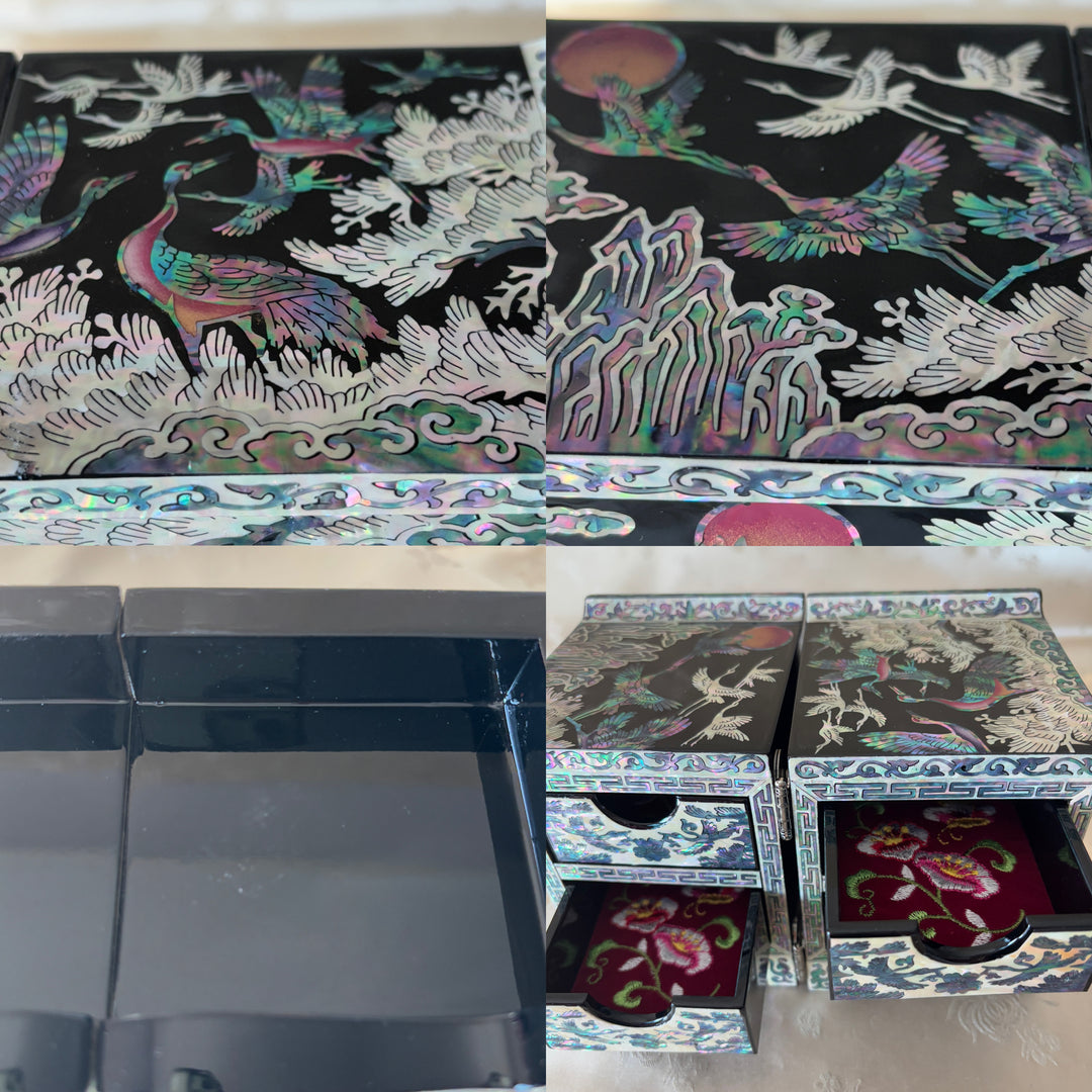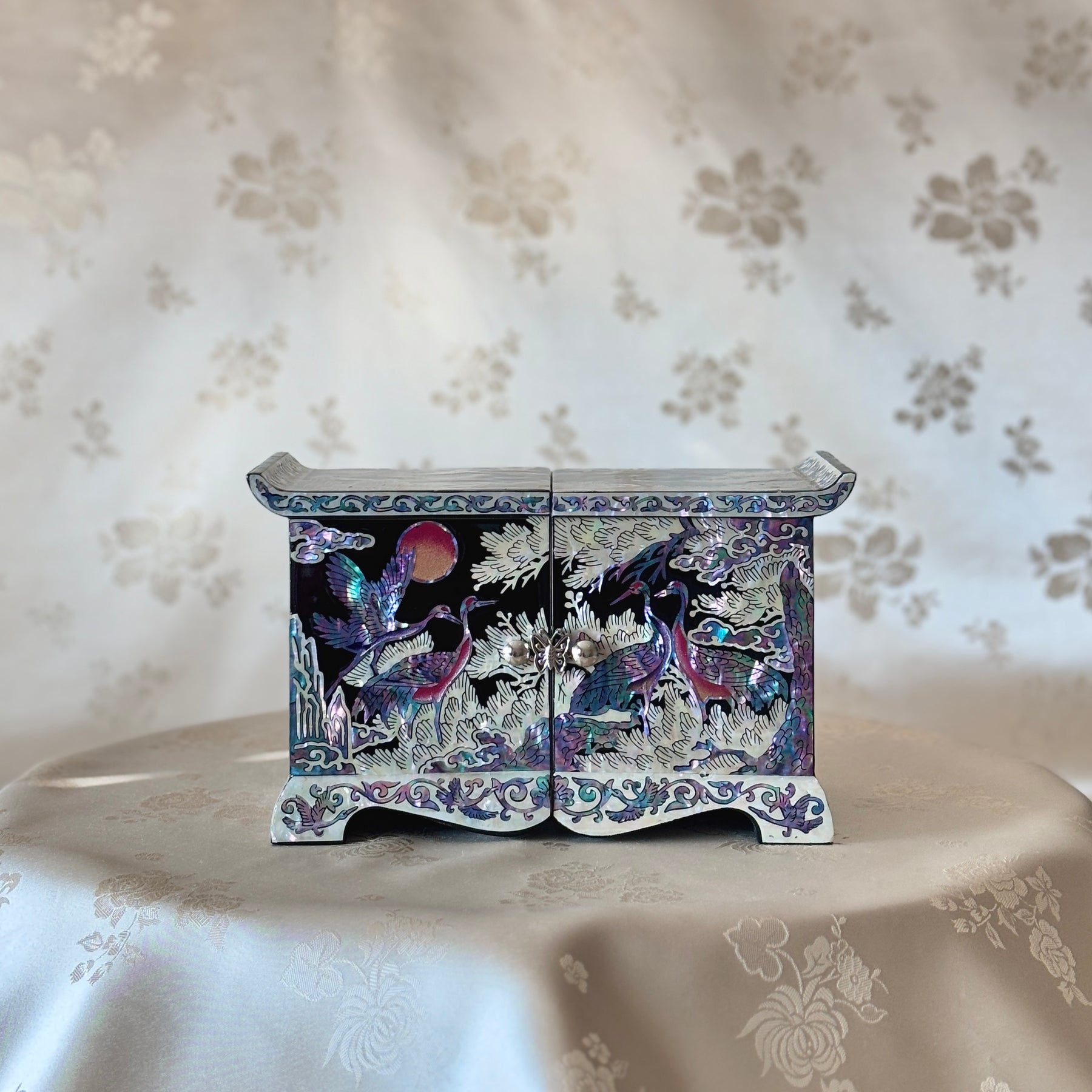 This Limited Luxurious Korean Traditional Handmade Mother of Pearl Jewelry Box celebrates the harmony of nature and elegance with its intricate pine and crane design. The hand-inlaid mother-of-pearl shimmers with iridescent hues, showcasing the artistry and dedication of skilled Korean craftsmen. With its unique shape and design, this jewelry box embodies both tradition and sophistication, making it an heirloom-worthy piece.