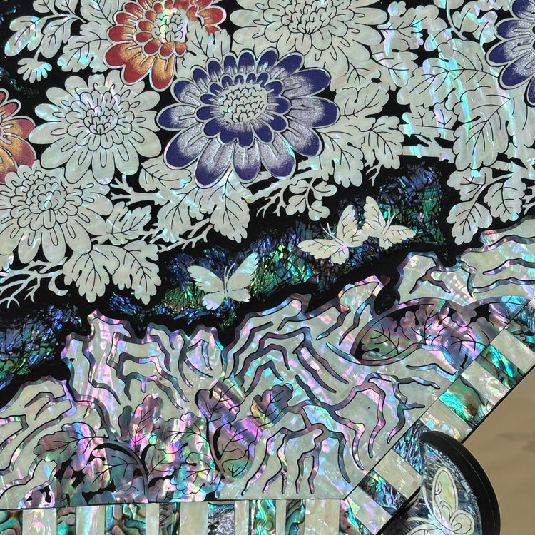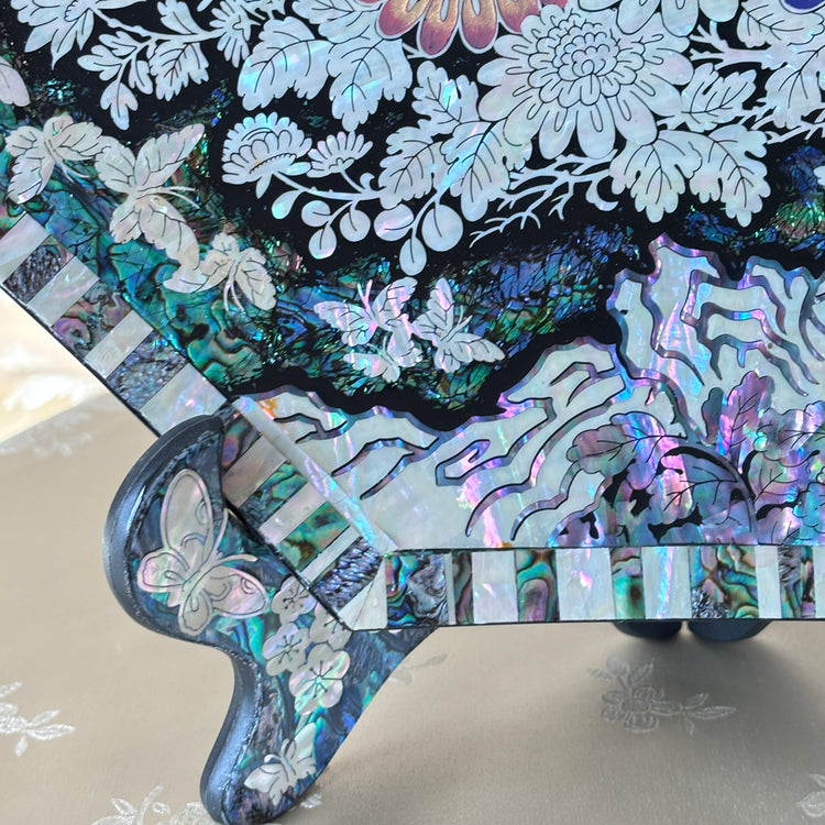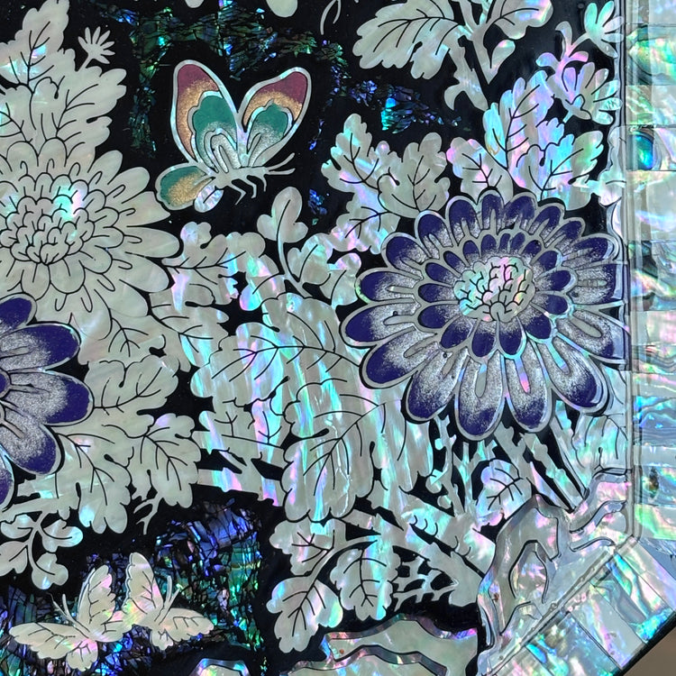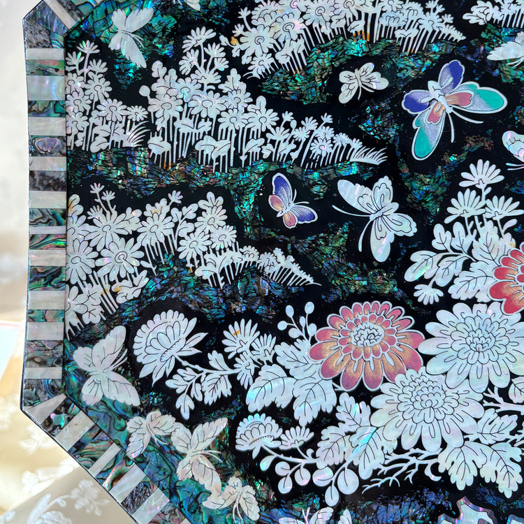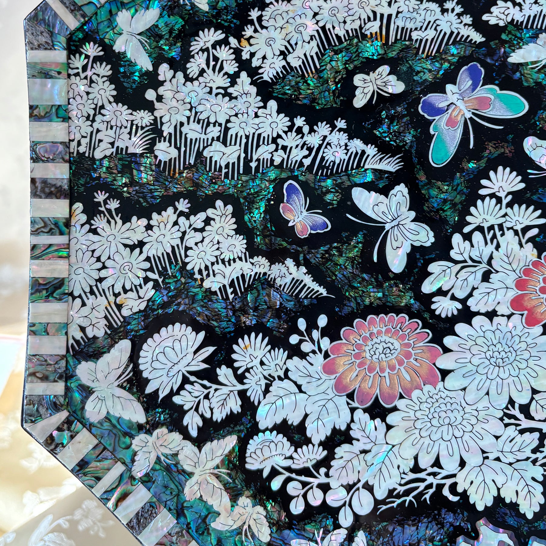 This exquisite octagonal tray brings together the timeless grace of Korean mother-of-pearl craft and the poetic symbolism of nature. Against a shimmering abalone background, chrysanthemums and butterflies unfold in harmonious rhythm—each inlay catching light in a constantly changing spectrum of iridescent hues.