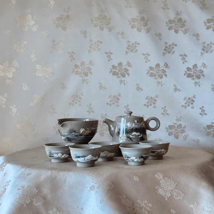 The set includes a side-handled teapot, three teacups, and a sukwoo—a traditional cooling bowl used in Korean tea ceremonies to gently lower the temperature of boiling water, ensuring that the delicate tea leaves release their full flavour without bitterness.
