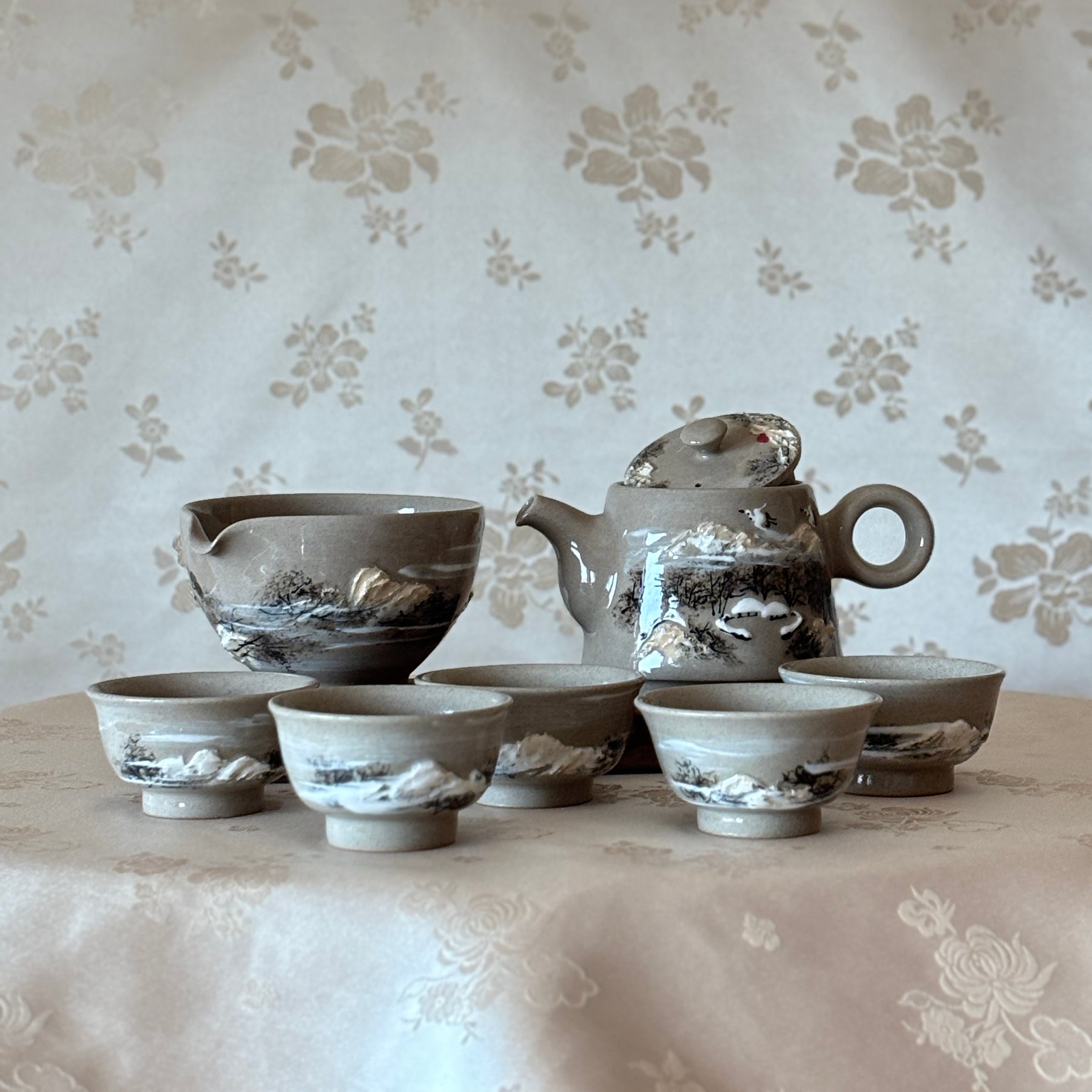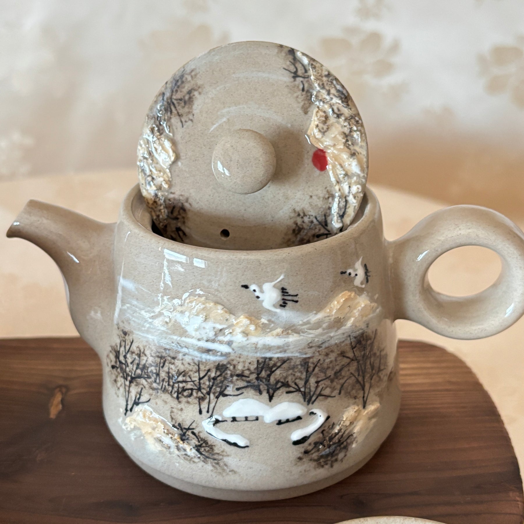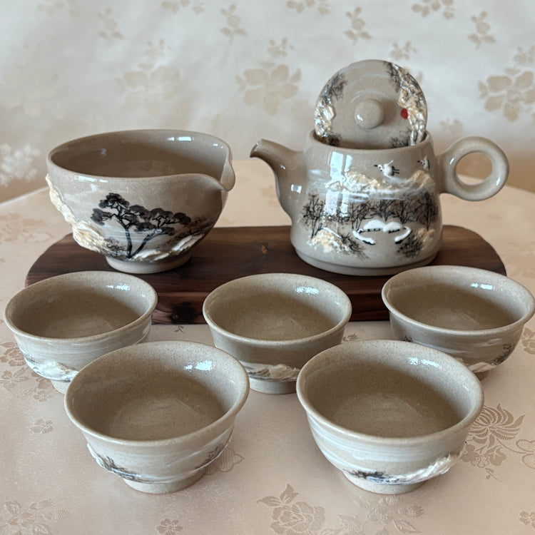 Buncheong Tea Set (Dagi): Relief-Applied Snowy Landscape Motif by Master Artisan, 5-Person Set