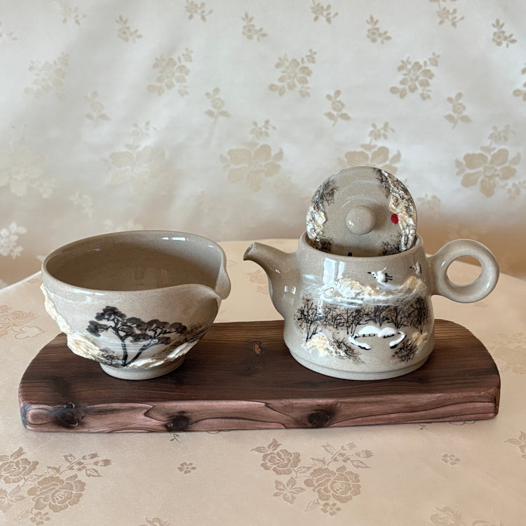 The natural ash-beige glaze, gently fogged with snowy tones, complements the theme of wintry stillness. Ideal for contemplative tea moments or as a collector’s art piece, this tea set invites slow appreciation—of both tea and craftsmanship.