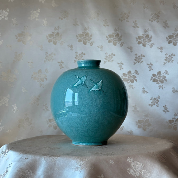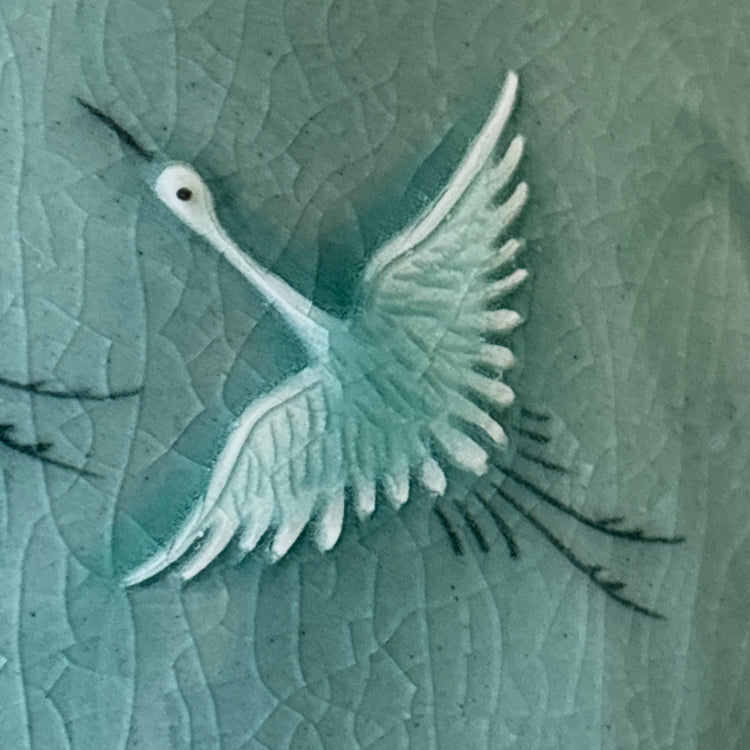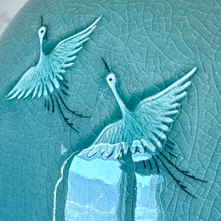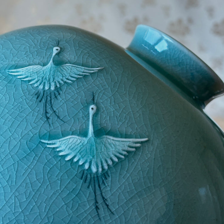 The crackled glaze—bingyeol—threads fine lines beneath the light, giving the still form a sense of time held in suspension. Here, celadon’s natural splendour meets the minimal finish of the paired cranes, and the harmony is achieved through what is left untouched.