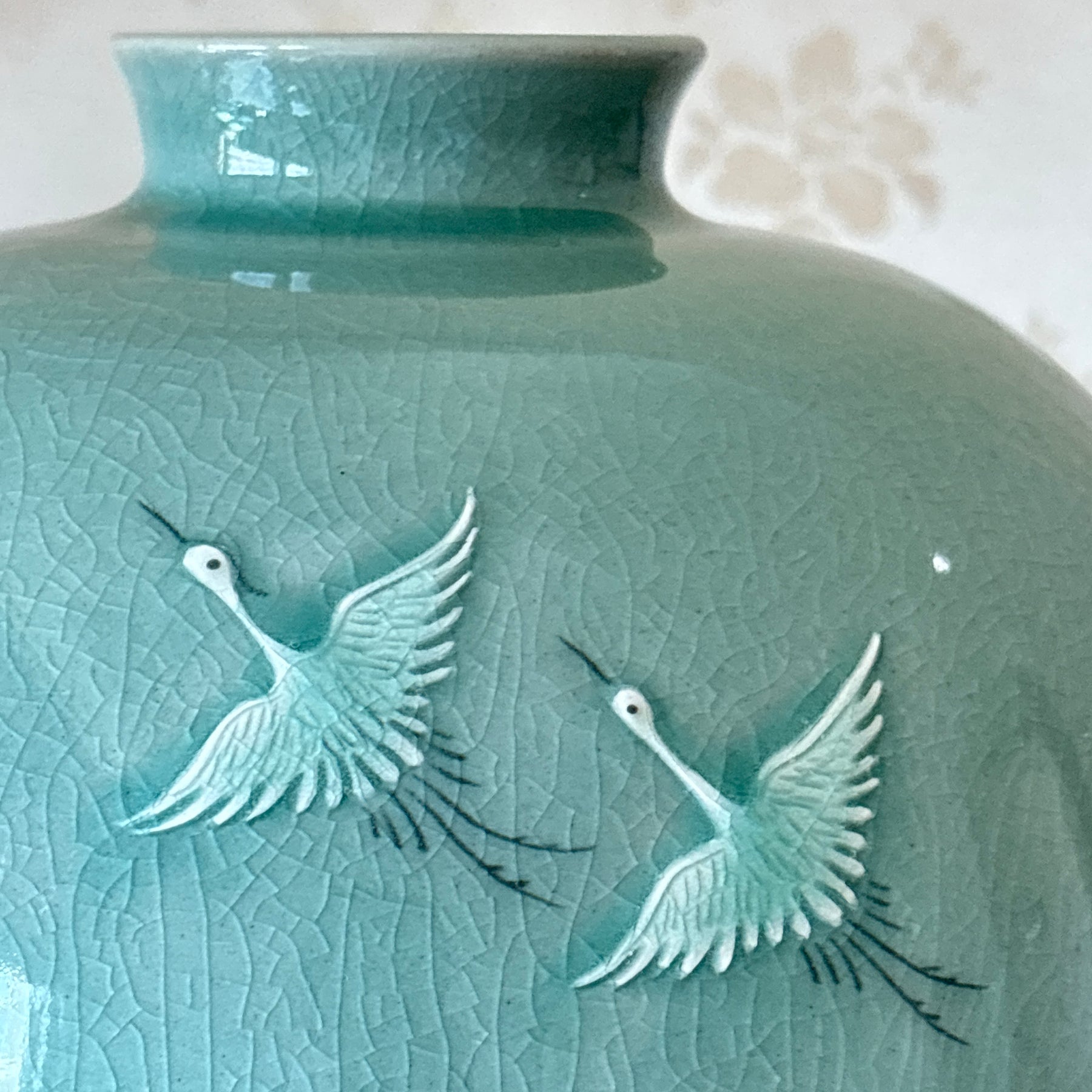 Celadon Vase: High-Relief Pair of Cranes by Master Artisan