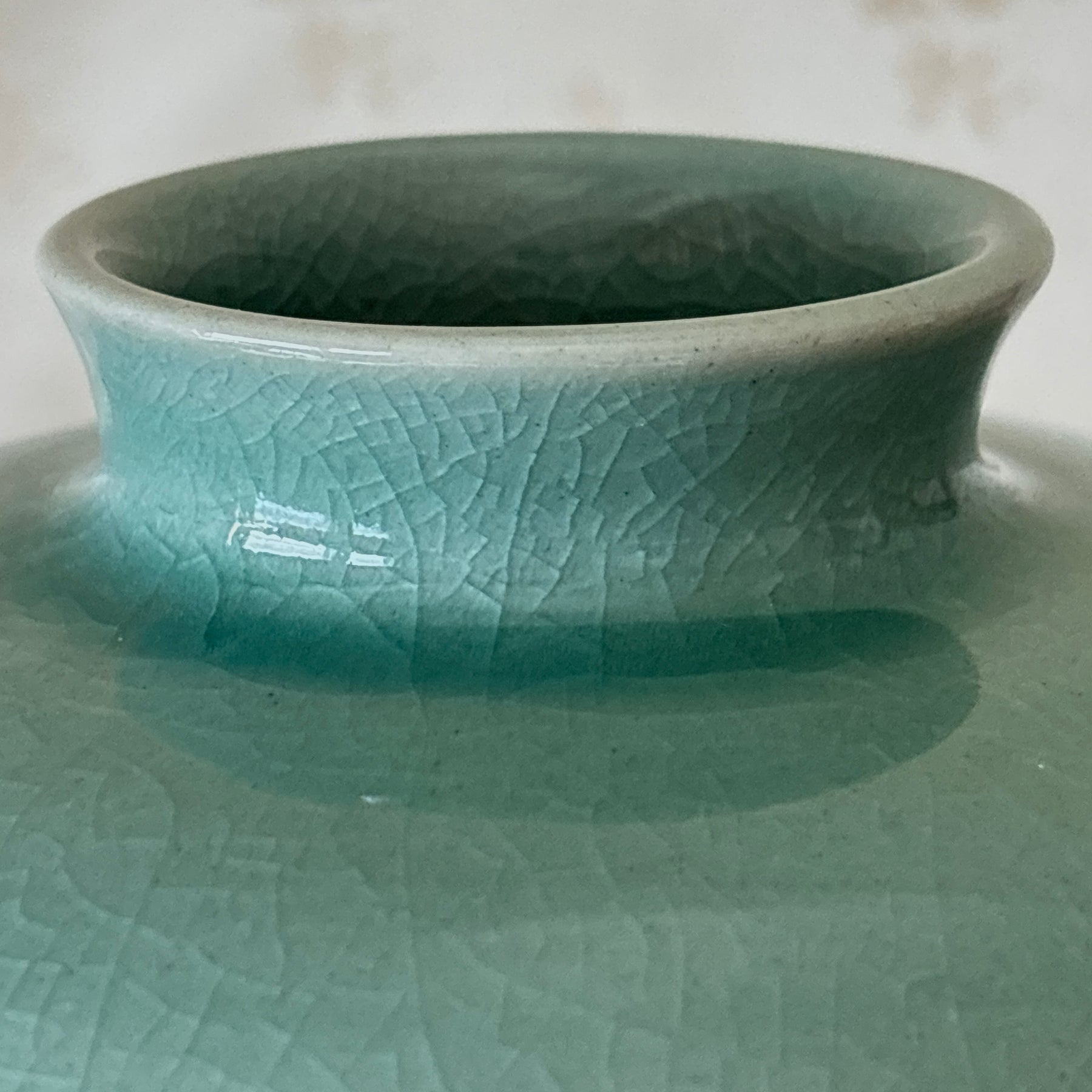 At once minimal and monumental, this round-bodied celadon vase invites sustained looking. Its blue-green glaze has the depth of translucent jade, and its soft craquelure gives the surface a quiet, internal animation—subtle, persistent, never decorative for its own sake.