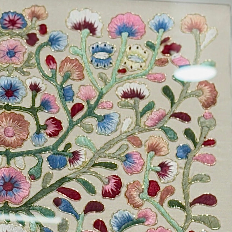 The rich burgundy silk forms a dramatic backdrop, enhancing the luminous shades of green, rose, ivory, and pale blue that ripple through the blossoms and curling leaves. Framed within a finely grained wooden structure, the embroidery is elevated to art—neither overtly opulent nor overly modest, but refined, balanced, and quietly radiant.