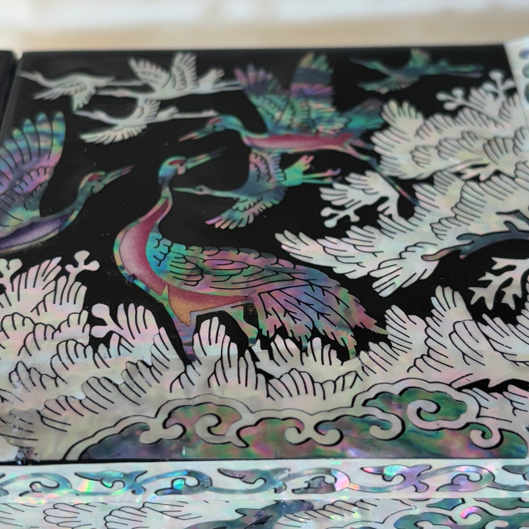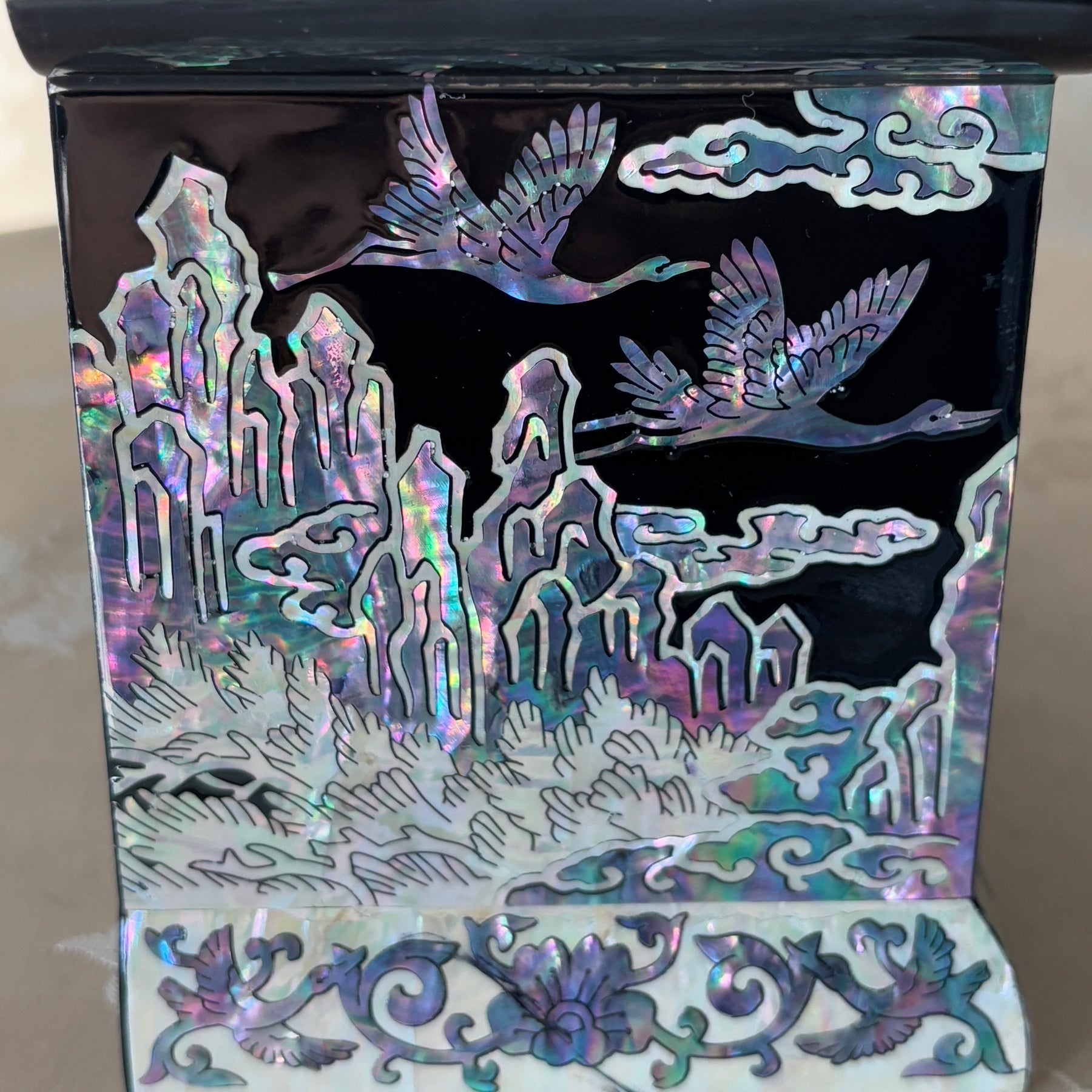 Mother of Pearl Jewelry Chest Pair: Black Body with Pine and Crane Motif in Scholar’s Desk Form