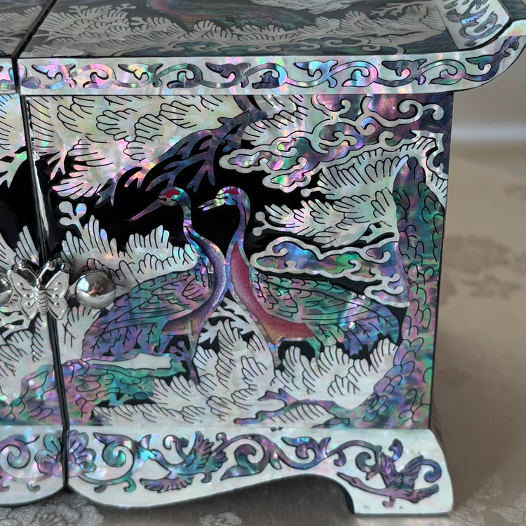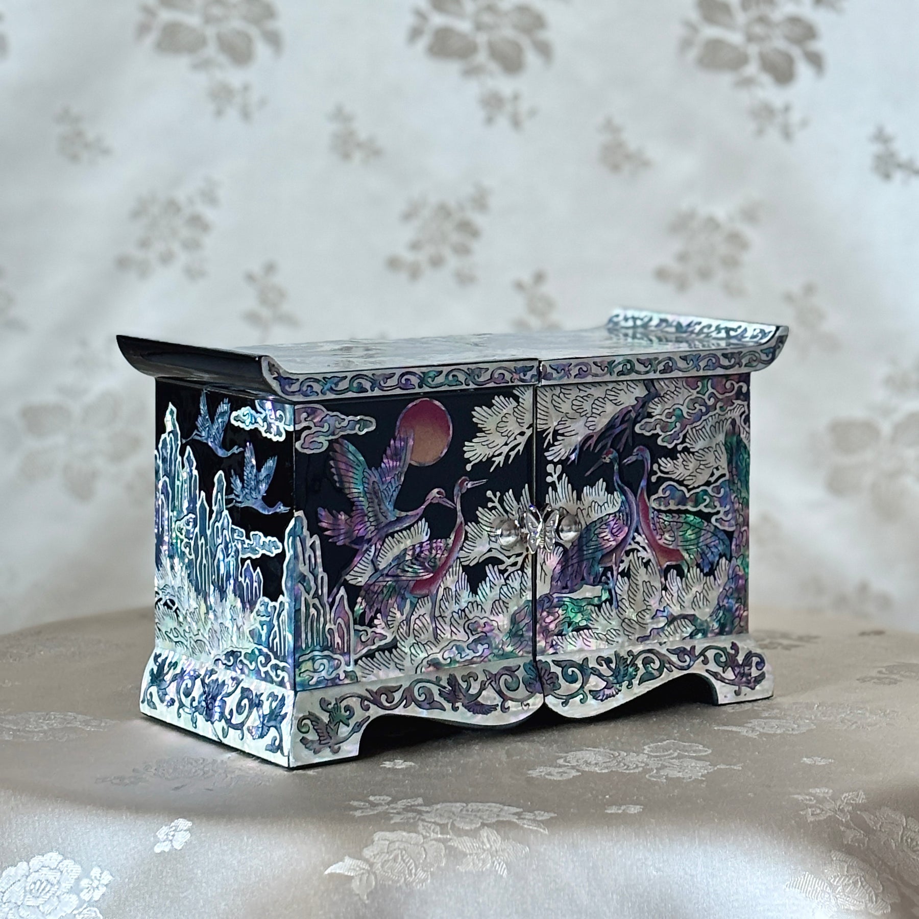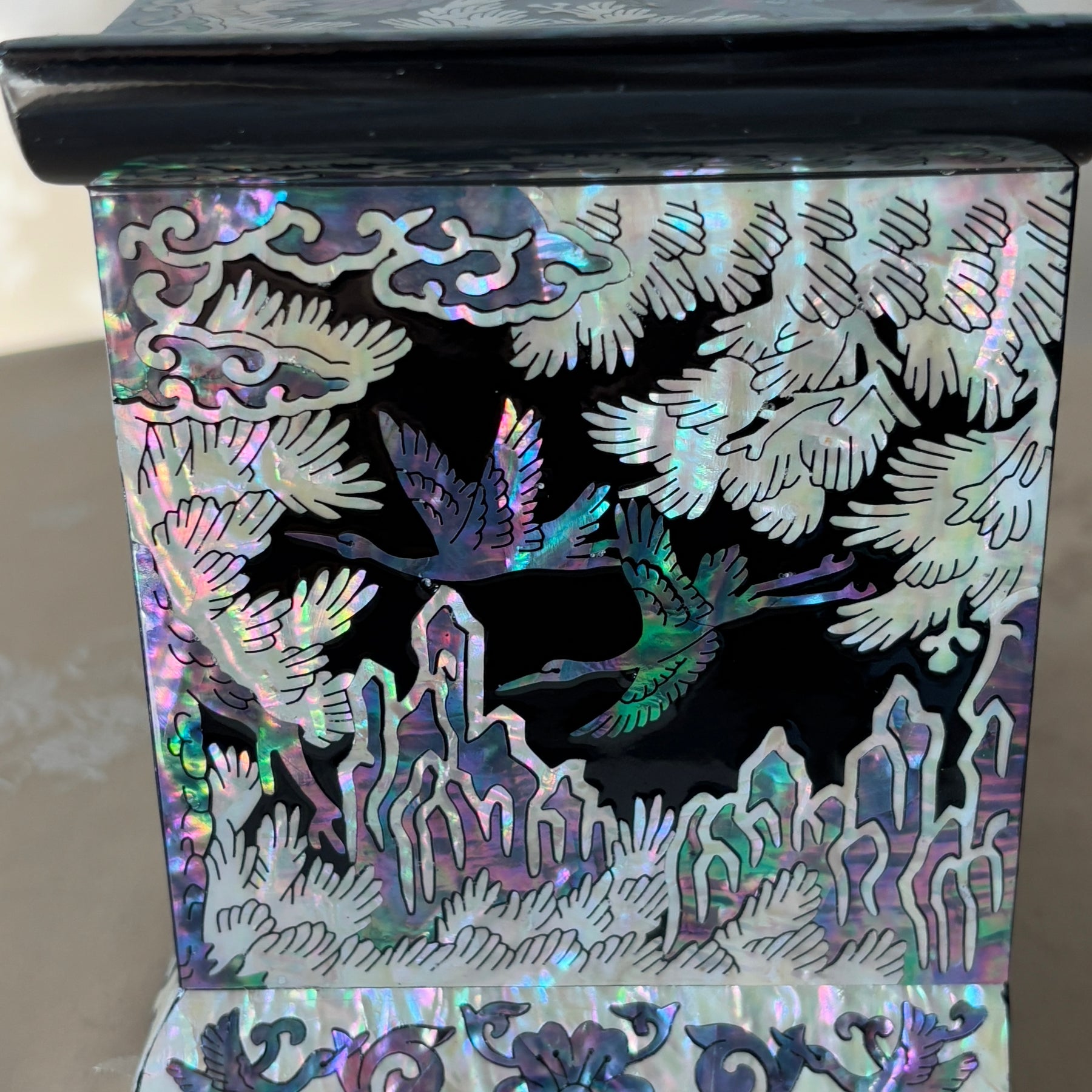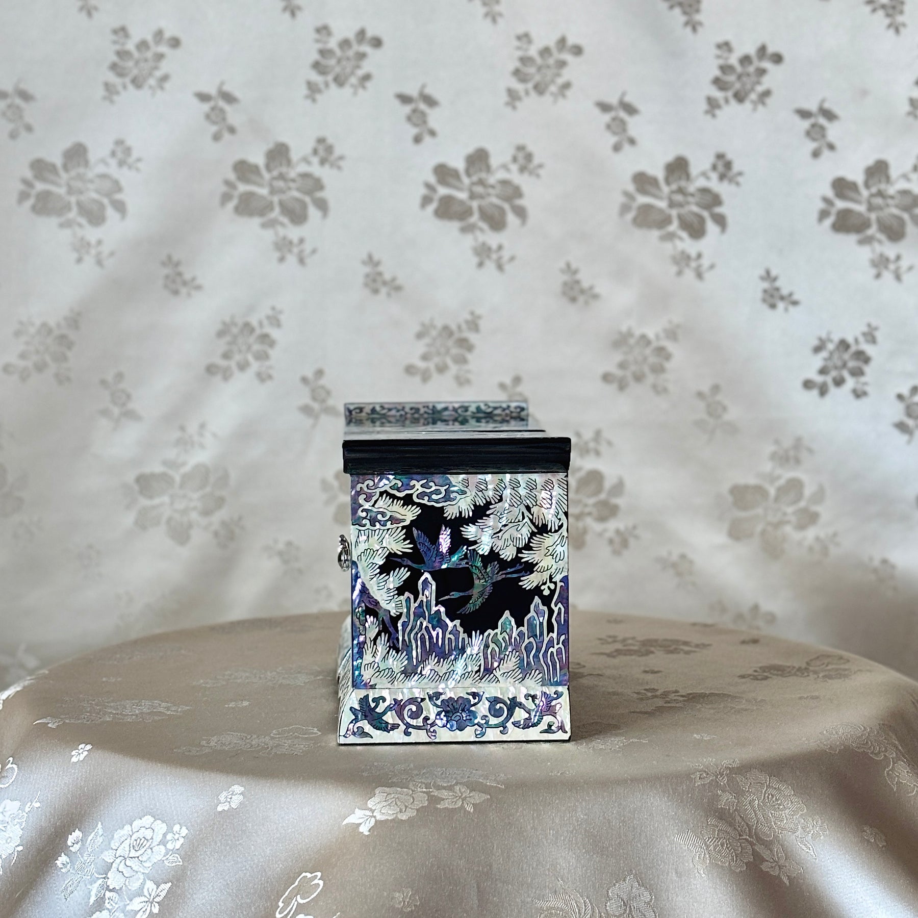 This Limited Luxurious Korean Traditional Handmade Mother of Pearl Jewelry Box celebrates the harmony of nature and elegance with its intricate pine and crane design. The hand-inlaid mother-of-pearl shimmers with iridescent hues, showcasing the artistry and dedication of skilled Korean craftsmen. With its unique shape and design, this jewelry box embodies both tradition and sophistication, making it an heirloom-worthy piece.