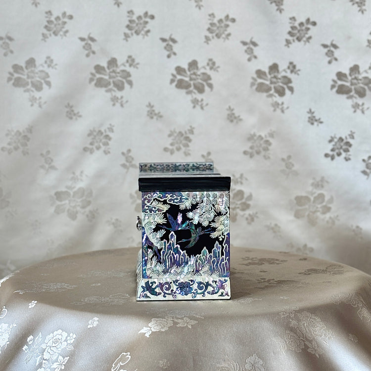 The design features a harmonious scene of pines, cranes, clouds, and mountains, symbolizing longevity, peace, and prosperity in Korean culture. Cranes are revered as auspicious creatures, while the pine tree represents resilience and steadfastness. This jewelry box encapsulates these meanings, offering not only a functional storage piece but also a daily reminder of nature’s beauty and life’s blessings.