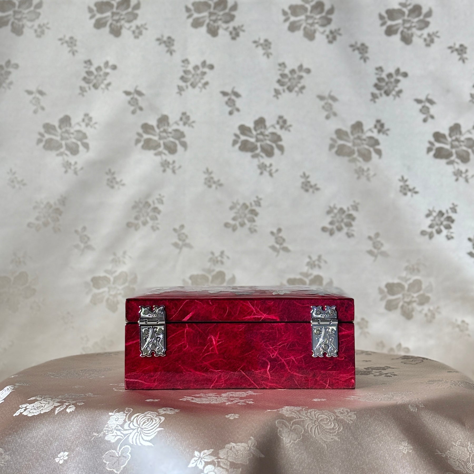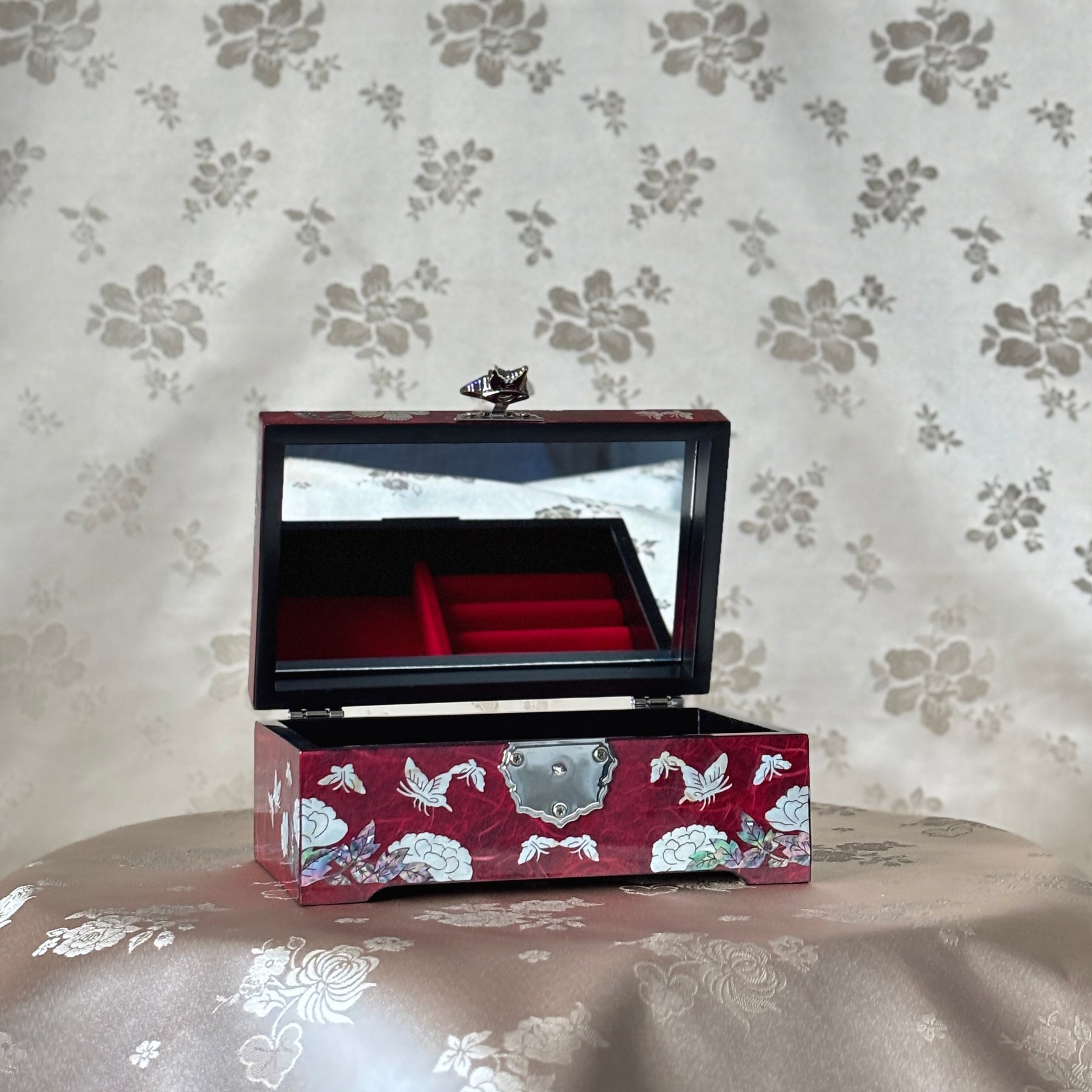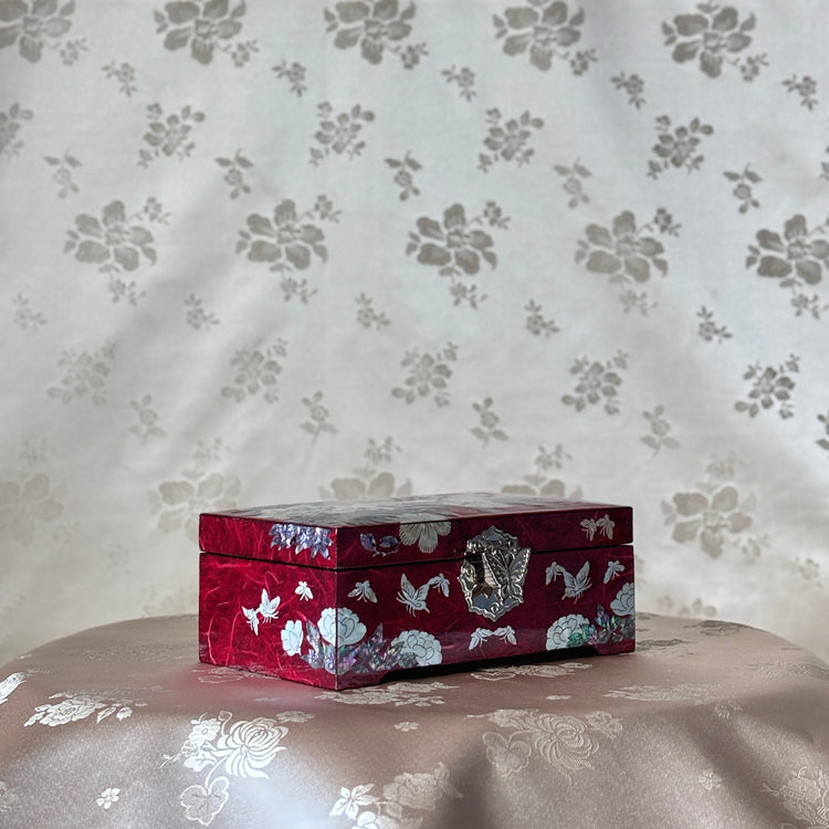 Mother of Pearl Jewelry Box: Butterfly and Plum Blossom Motifs on Red Hanji