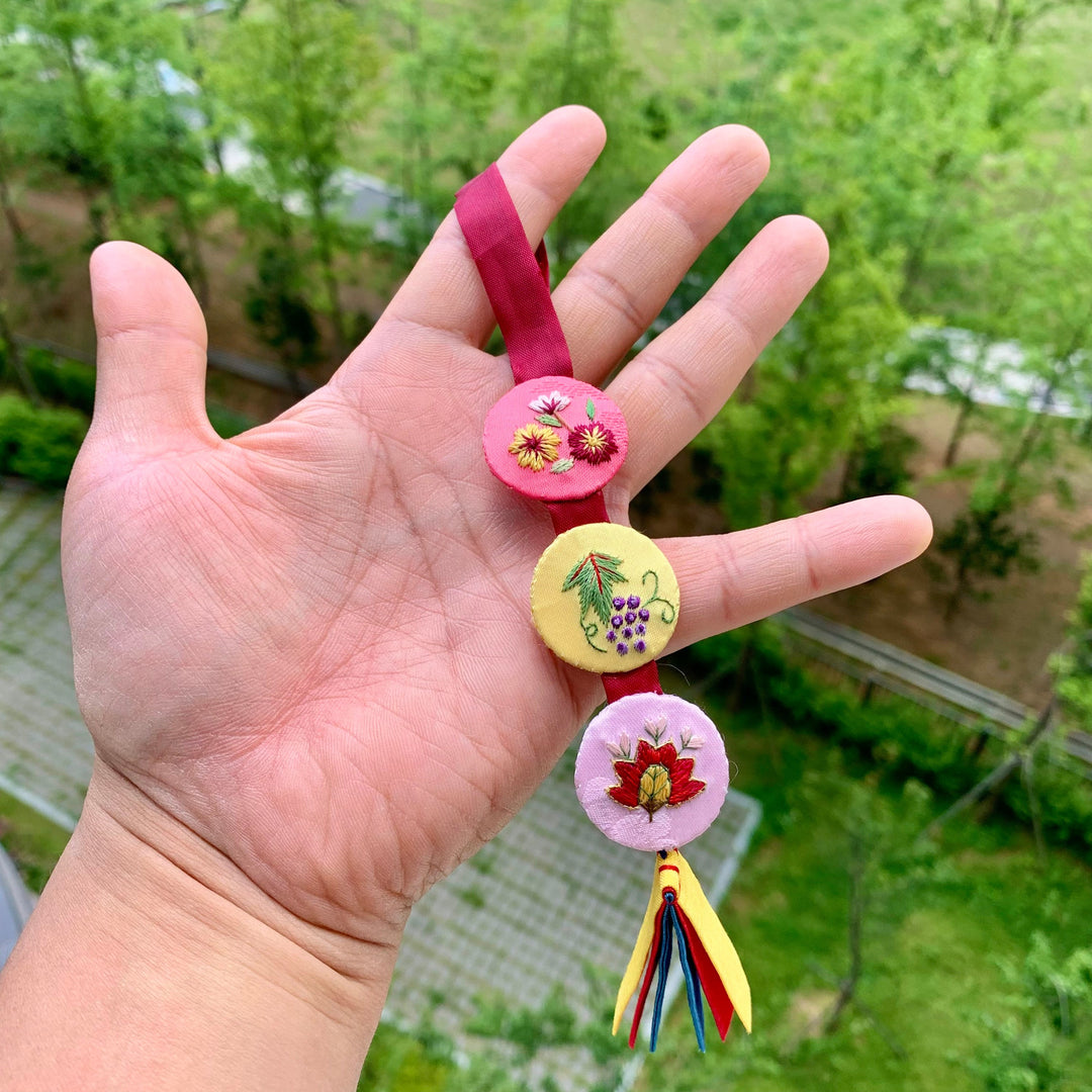 Norigae (hangul: 노리개) is a typical, traditional Korean accessory that is hung from a woman’s jeogori goreum (coat strings) or hanbok chima (skirt) and so on. Three parts norigae with bat ornaments A norigae can be divided into 4 parts: the ddidon (hangul : 띠돈; hanja: 帶金) a hook (either a separate accessory or additional knots) to attach the norigae to the hanbok, the paemul (hangul : 패물) the main ornament of the norigae, the maedeup (hangul : 매듭) the knots of the norigae, and the sul (hangul : 술) the tassels. The norigae’s function as a decorative pendant is both a good-luck charm hoped to bring something such as eternal youth, wealth or many sons (depending on its shape), as well as a fashion accessory. Usually, the norigae from the parents’ or in-laws’ home was passed down to descendants. Norigaes have various shapes derived from nature or from everyday life. They are divided into samjaks (hangul : 삼작; hanja: 三作) and danjaks (hangul : 단작; hanja: 單作), and samjaks can then be divided again into daesamjaks and sosamjaks. Daesamjaks and sosamjaks have the same form, but each one’s paemul is different. Dimensions: 3x21cm