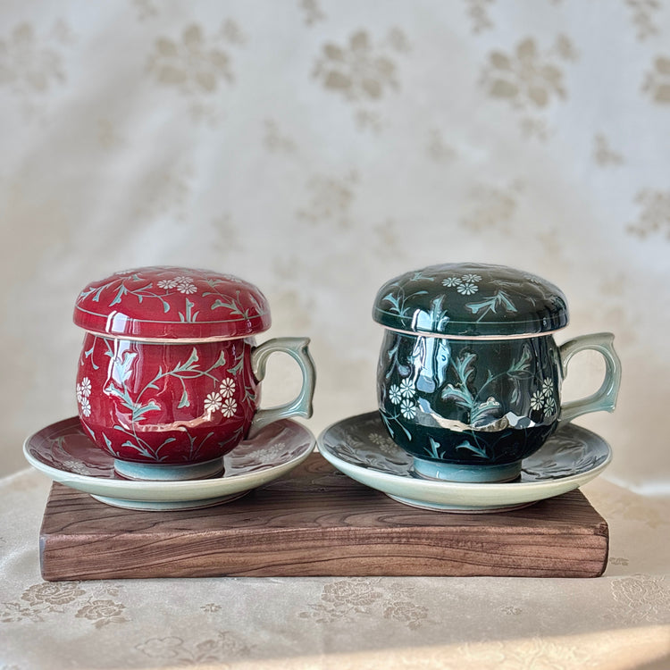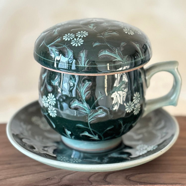 The set is made using the traditional sgraffito inlay technique, where the chrysanthemum stems are carved in relief, while the flowers are filled with white clay for a refined finish. This technique, combined with the glossy celadon glaze, gives each cup a unique texture and depth, making it more than just a functional item but a piece of Korean heritage.