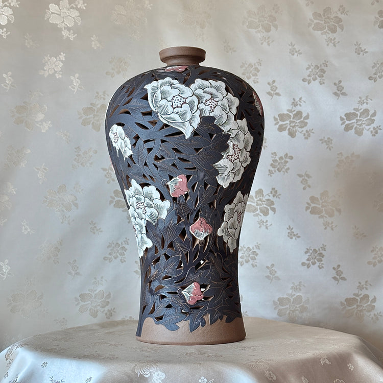 Buncheong Openwork Vase Set: Grand-Scale, Peony Motif with Three-Color Slip, Unglazed Finish