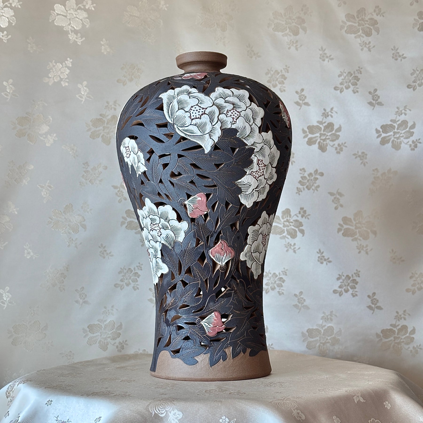 Without glaze, the surface absorbs light rather than reflecting it. This gives the vases a muted authority that suits Buncheong particularly well. Their beauty is not dependent on brilliance, but on depth of surface, carved edge, and the quiet life of the clay itself. For that reason, they reveal more over time. One first sees the peonies; then the relief, the piercing, the restraint, and the discipline that hold the whole together.