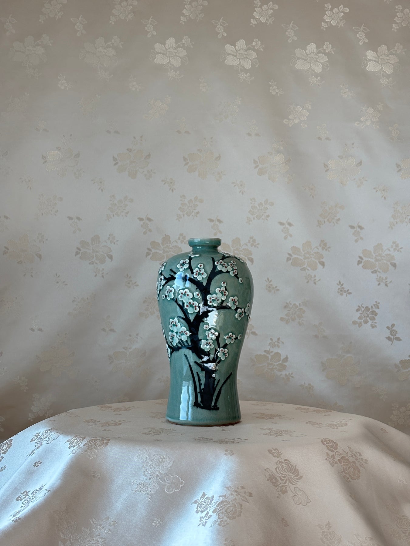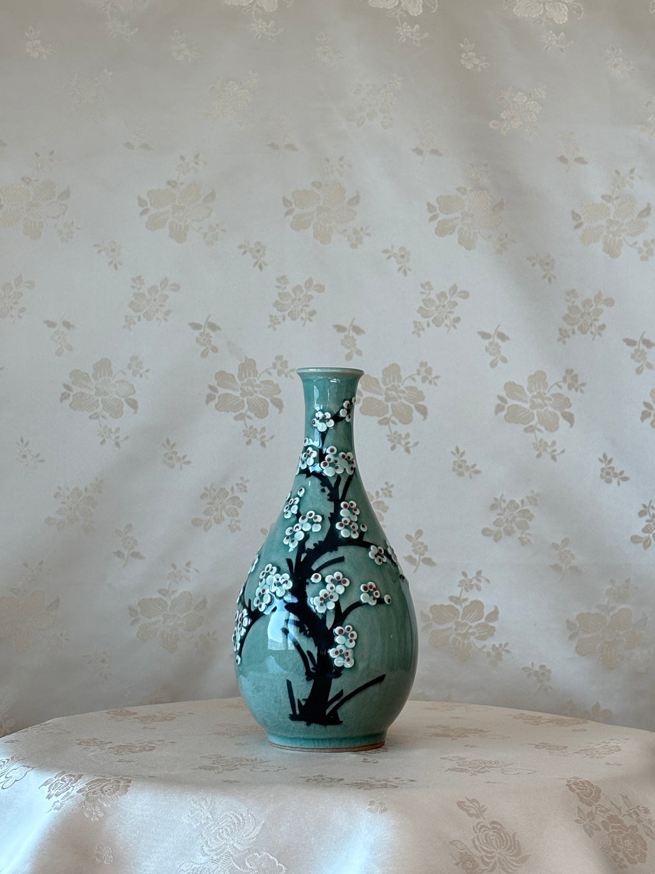 Created by the Icheon ceramic artist Geunjeong Lee Sang-bong, this maebyeong and jubyeong set is defined by its exquisite Jade Celadon glaze. It is a color that doesn't just sit on the surface; it has a translucent depth that feels as though it was pulled from the heart of a river. This "jade water" becomes the atmosphere in which the artist's plum tree lives and breathes.