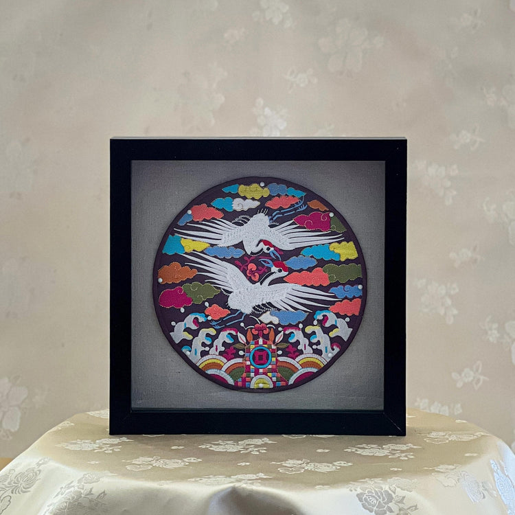 This embroidered wall art offers a poetic harmony of colour and symbolism—two cranes gliding in mirrored motion, surrounded by waves, clouds, droplets, rocks, and mythical fungi. The balanced composition is not merely decorative but steeped in meaning, each element traditionally representing harmony, longevity, and natural abundance.