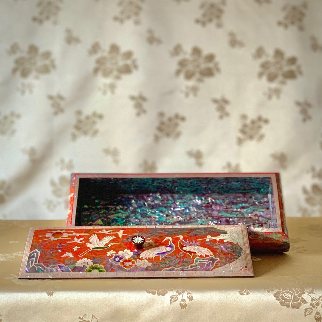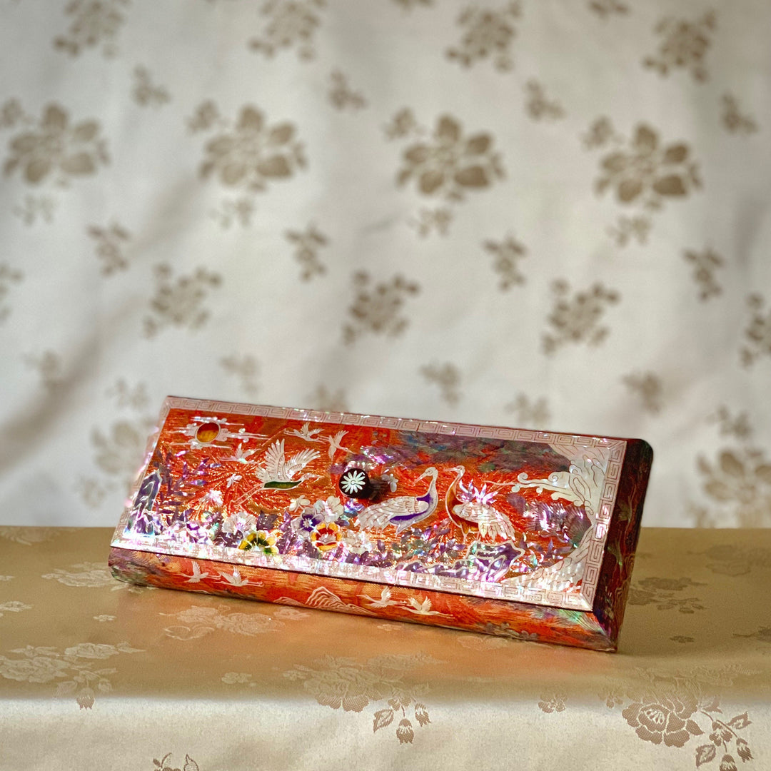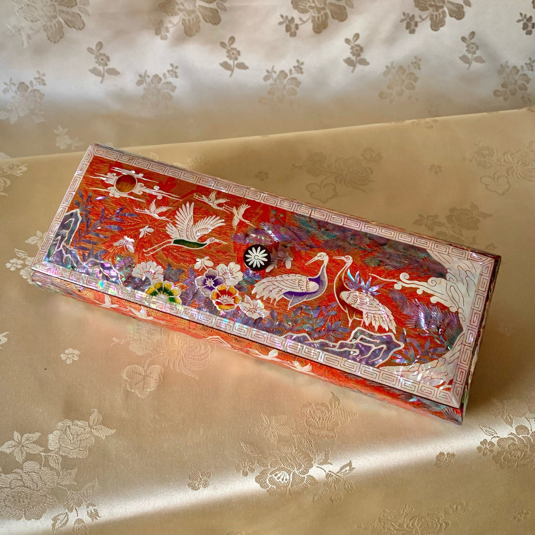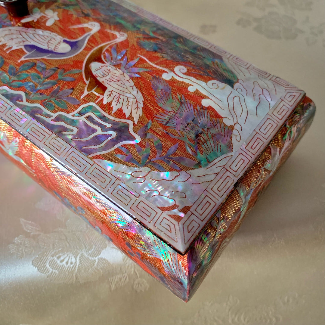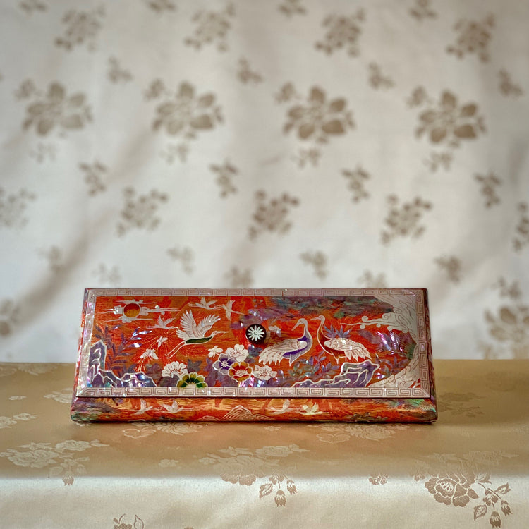 Orangefarbene Schmuck- oder Bleistiftbox aus Perlmuttseide mit Kranichmuster (자개 송학문 비단 굴림 필함)