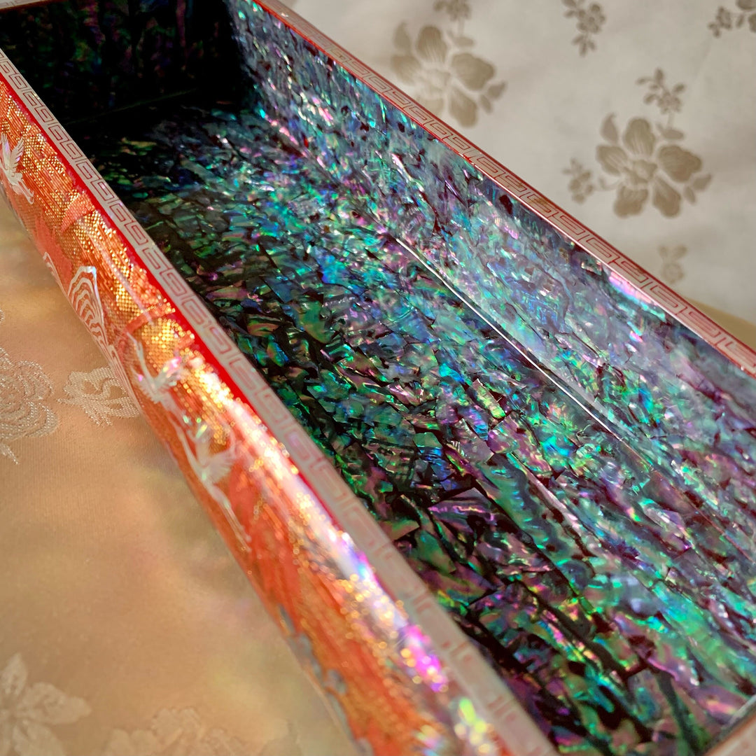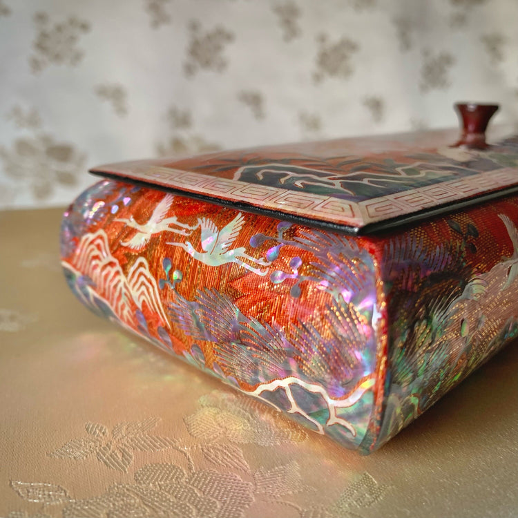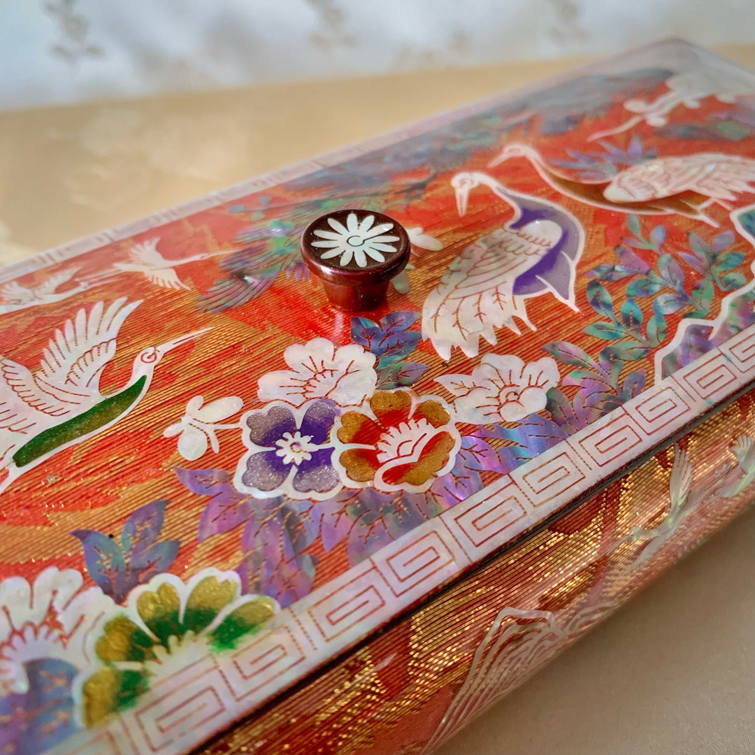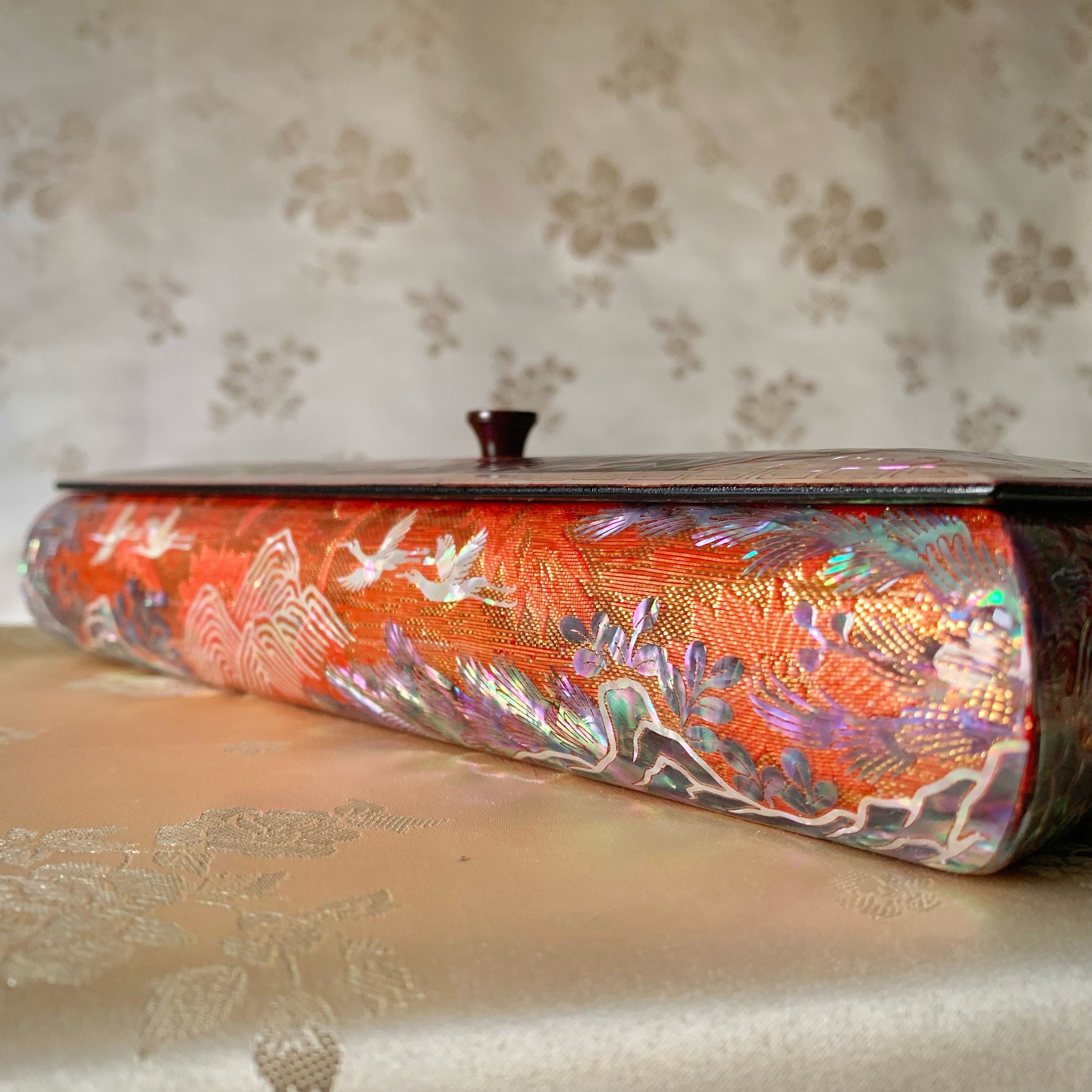 Orangefarbene Schmuck- oder Bleistiftbox aus Perlmuttseide mit Kranichmuster (자개 송학문 비단 굴림 필함)