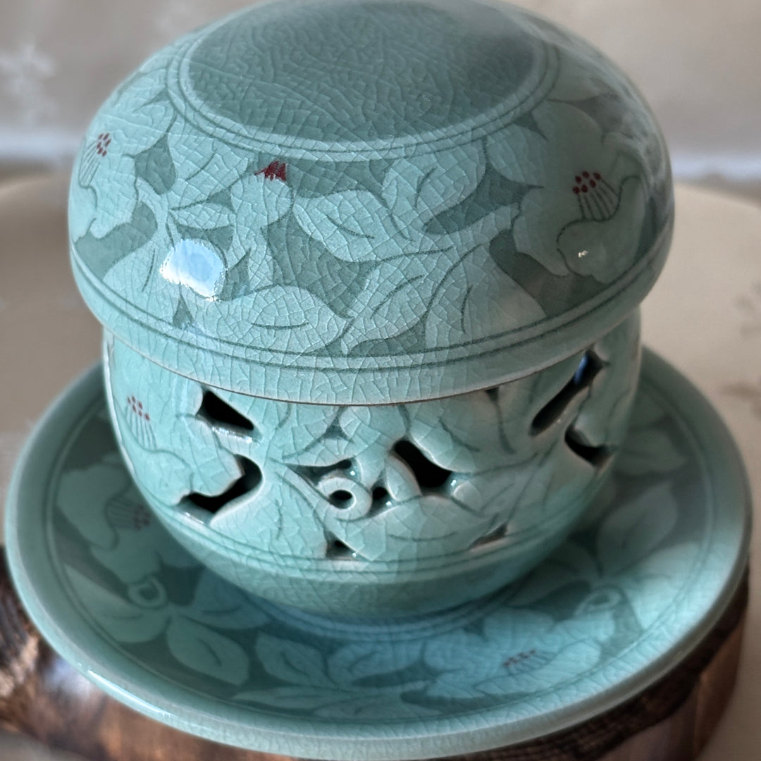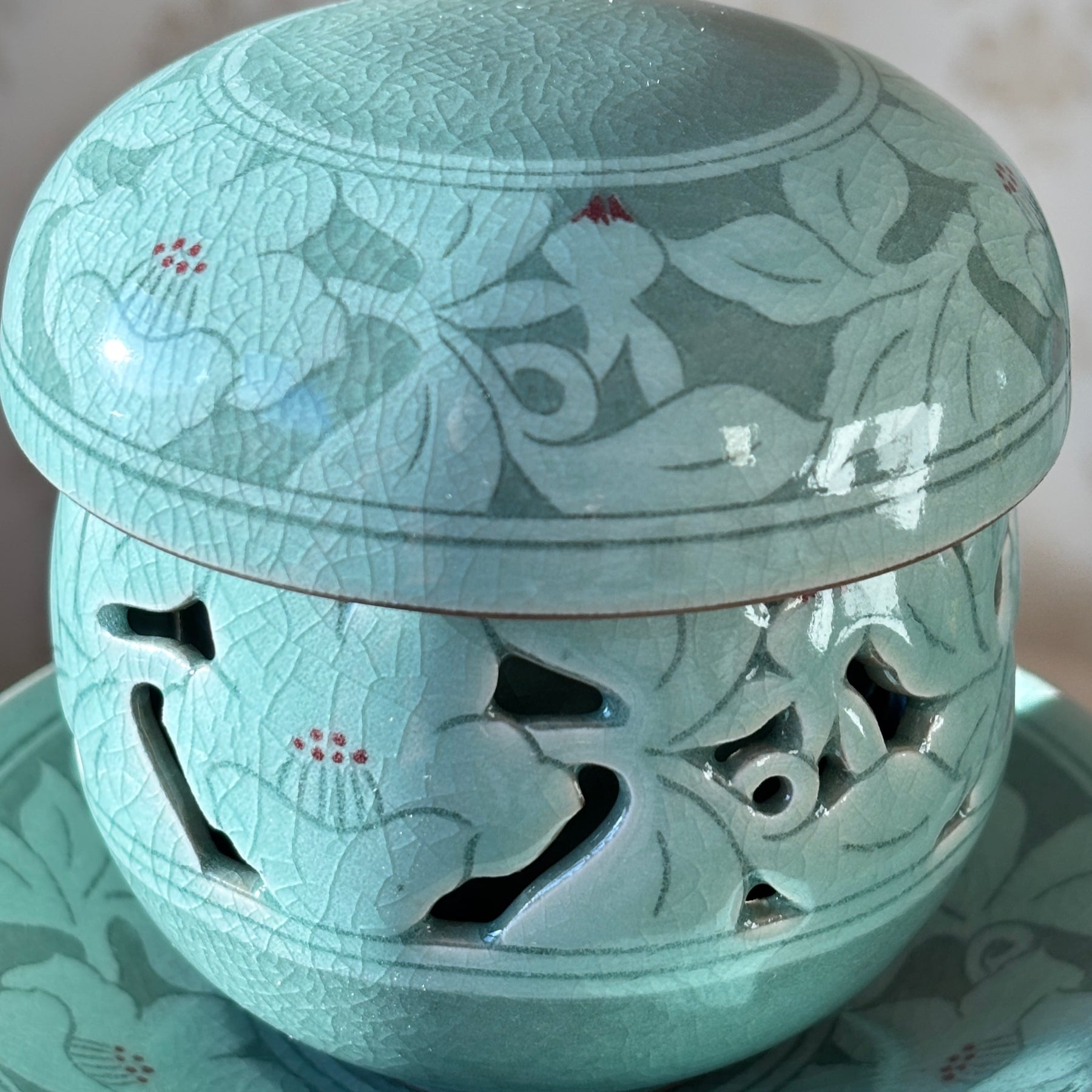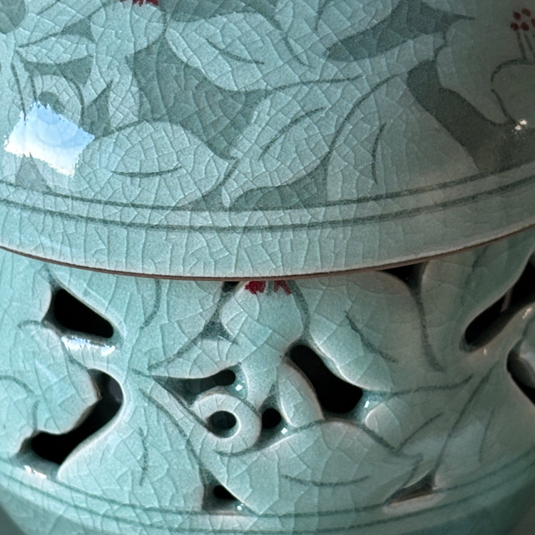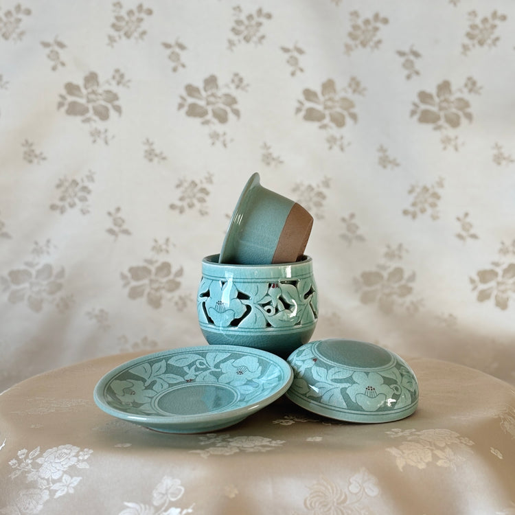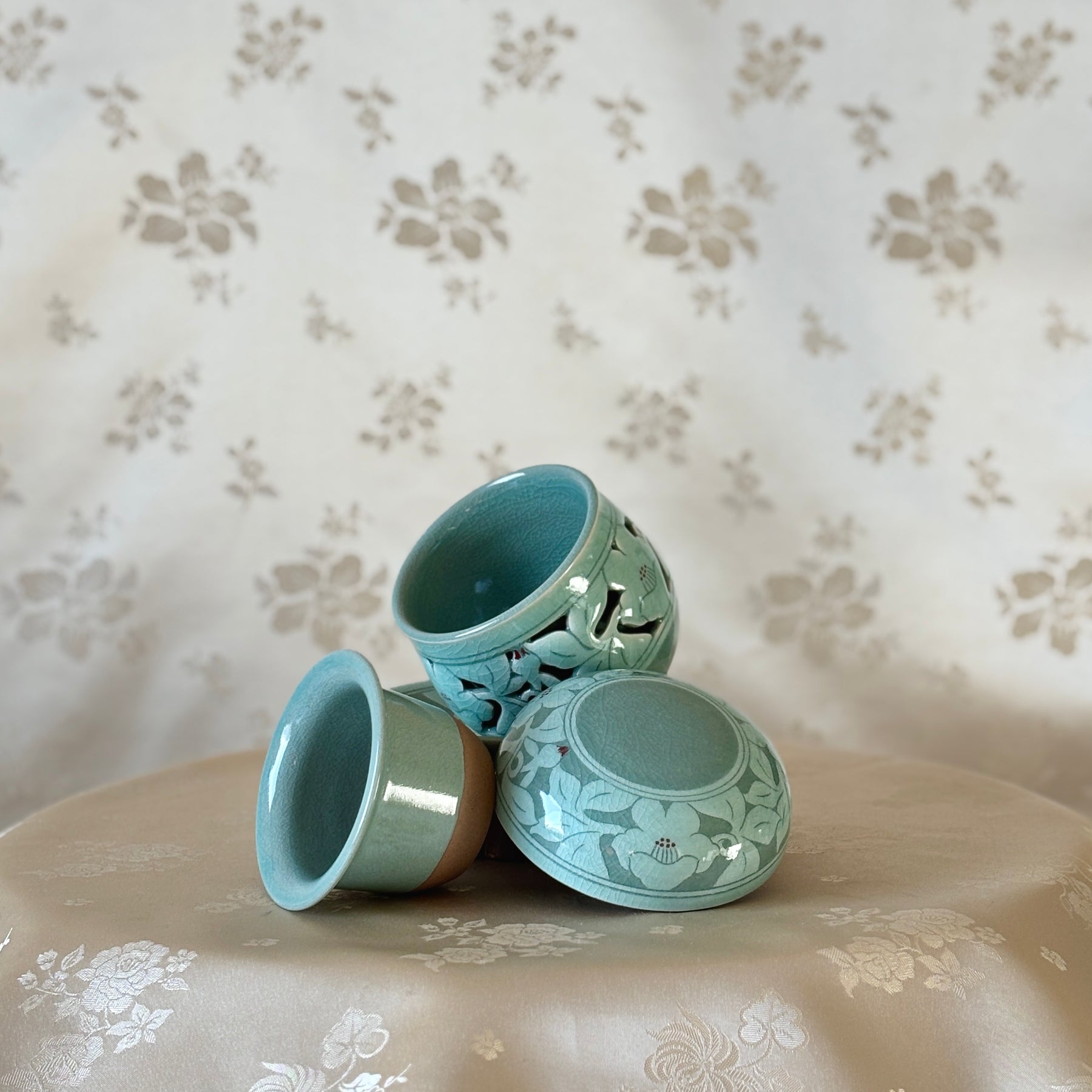 Die Herstellung eines doppelwandigen durchbrochenen Stücks ist eine anspruchsvolle Technik, die außerordentliche Präzision und Geduld erfordert. Während des Brennvorgangs schrumpft das Seladon auf natürliche Weise, was es in Kombination mit dem durchbrochenen Design schwierig macht, die perfekte Form der Tasse beizubehalten. Diese Methode unterstreicht die Fachkompetenz und Hingabe des Handwerkers zur Perfektion und führt zu einem einzigartigen Stück, das nur wenige andere nachbilden können. Der Besitz dieser Teetasse ist, als ob man ein Stück koreanisches Kulturerbe in den Händen hält.