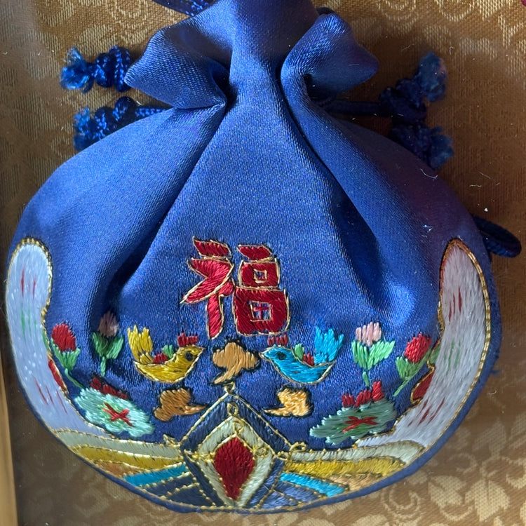 Dieses exquisite, gerahmte Set aus fünf traditionellen koreanischen Glücksbeuteln ist eine zeitlose Darstellung von Glück, Harmonie und Wohlstand. Jeder seidenbestickte Beutel ist sorgfältig gefertigt und zeigt die fünf traditionellen Farben Blau, Weiß, Rot, Schwarz und Gelb, die die fünf Himmelsrichtungen (오방, 五方) der koreanischen Kultur symbolisieren. Historisch am königlichen Hof und in Adelshäusern verwendet, sollen diese Farben Glück anziehen und vor Unglück schützen, was dieses Stück sowohl bedeutungsvoll als auch optisch beeindruckend macht.
