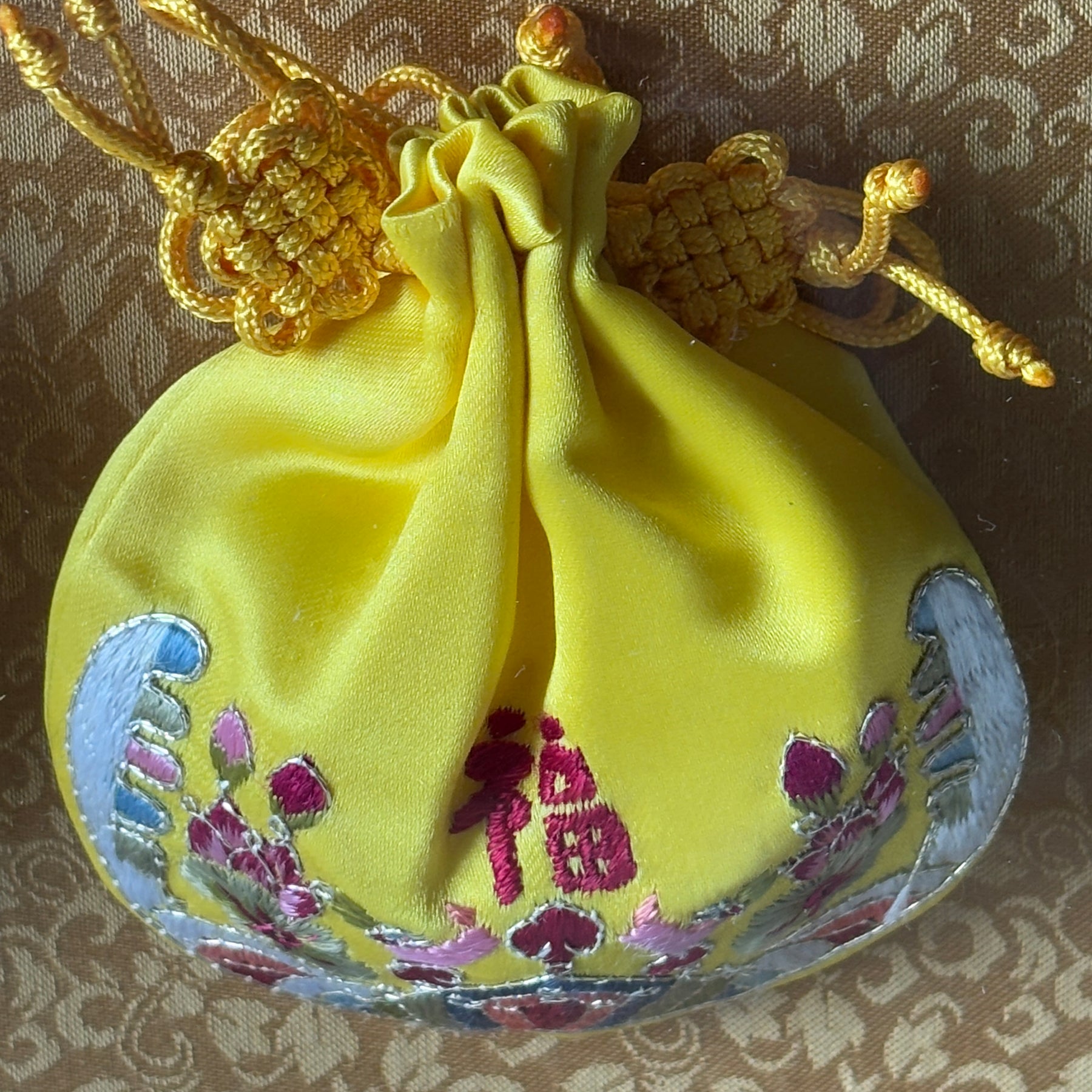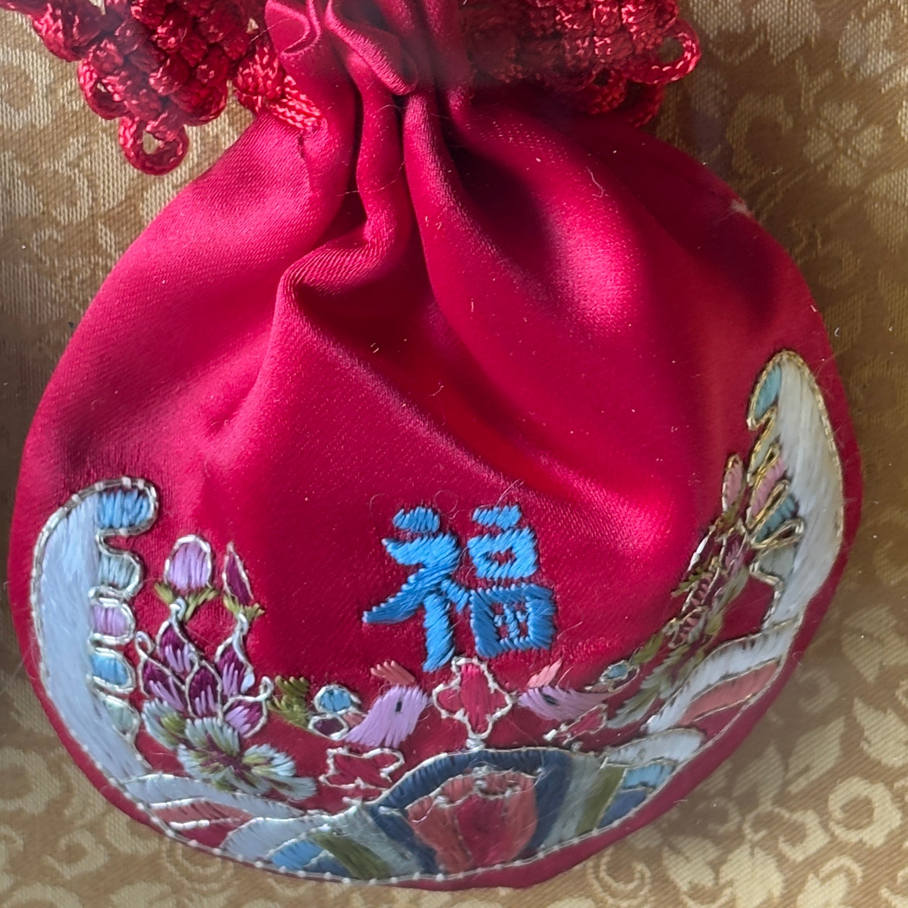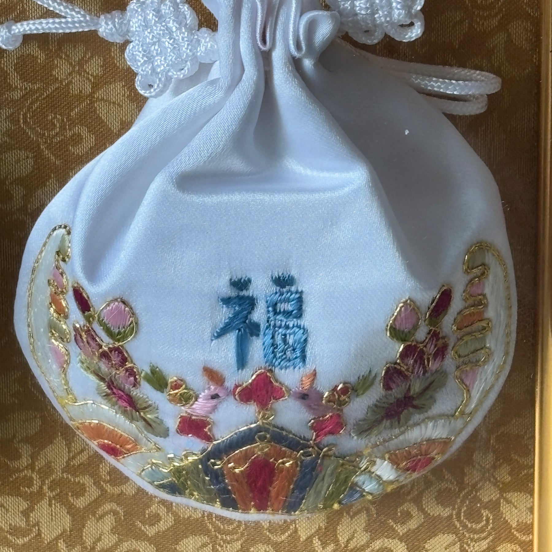 In einem eleganten vergoldeten Rahmen angeordnet, bewahren diese Beutel nicht nur die Tradition, sondern stellen auch ein eindrucksvolles Dekorationsstück dar, das kulturelle Bedeutung mit raffinierter Kunstfertigkeit verbindet.