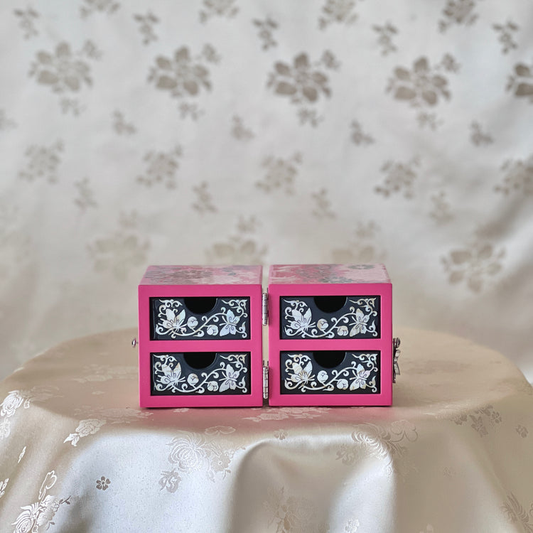 Dieses atemberaubende Stück wurde von Hand mit aufwendigen Perlmutteinlagen gefertigt und zeigt ein bezauberndes Muster aus Ranken, Chrysanthemen und zarten Schmetterlingen. Lüften Sie seine Geheimnisse und entdecken Sie vier geräumige Schubladen, die sich perfekt zum Aufbewahren Ihrer wertvollsten Schätze und kleiner Wertgegenstände eignen.