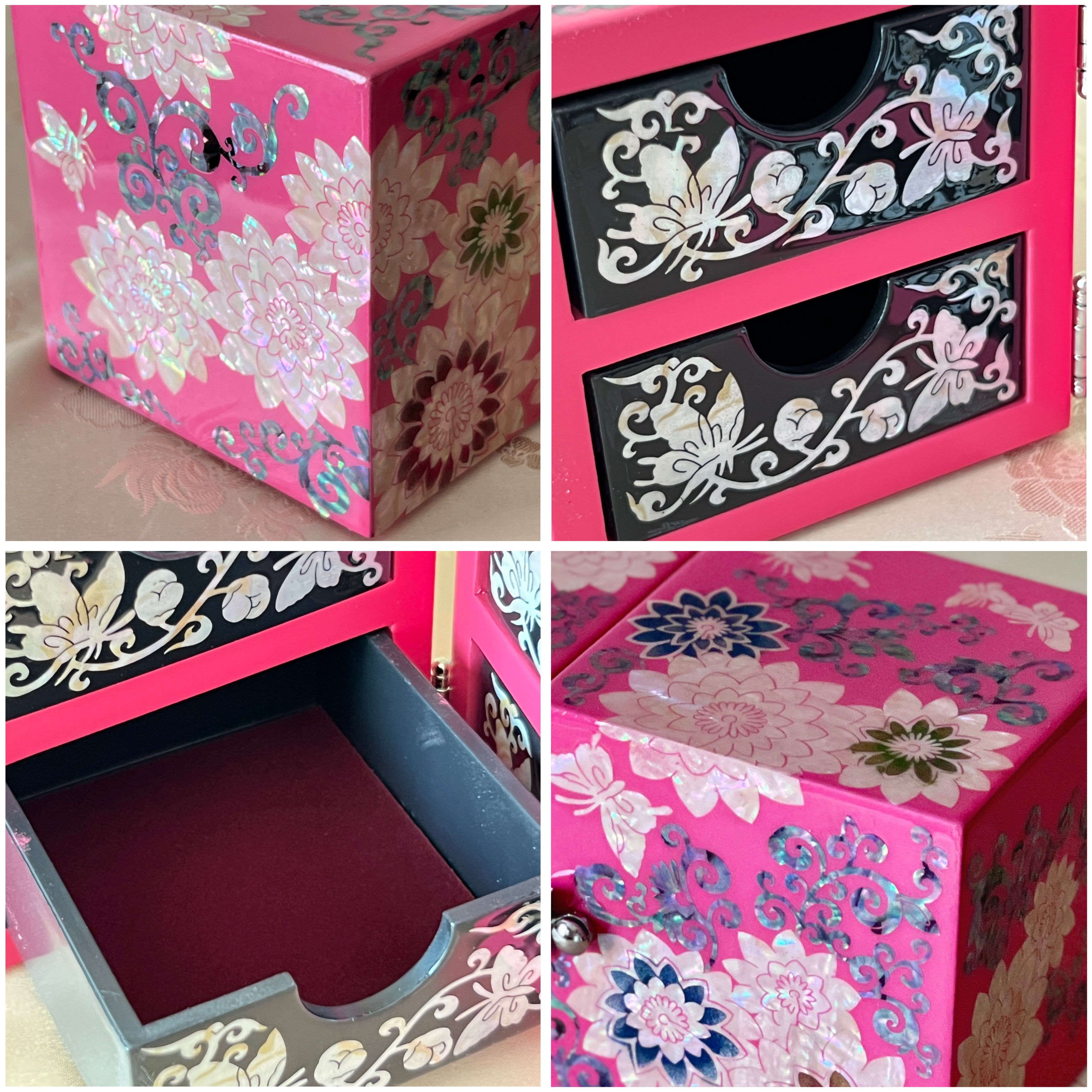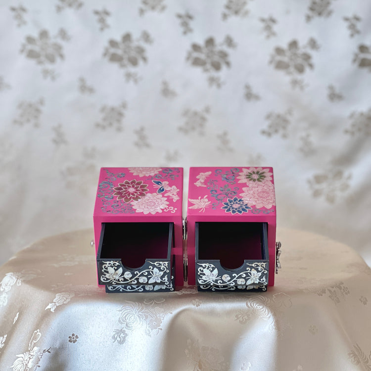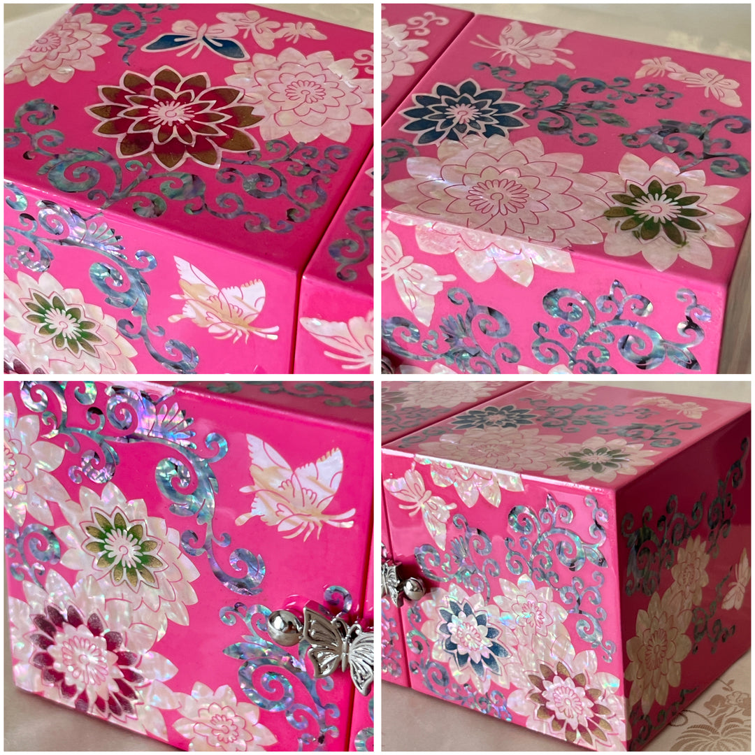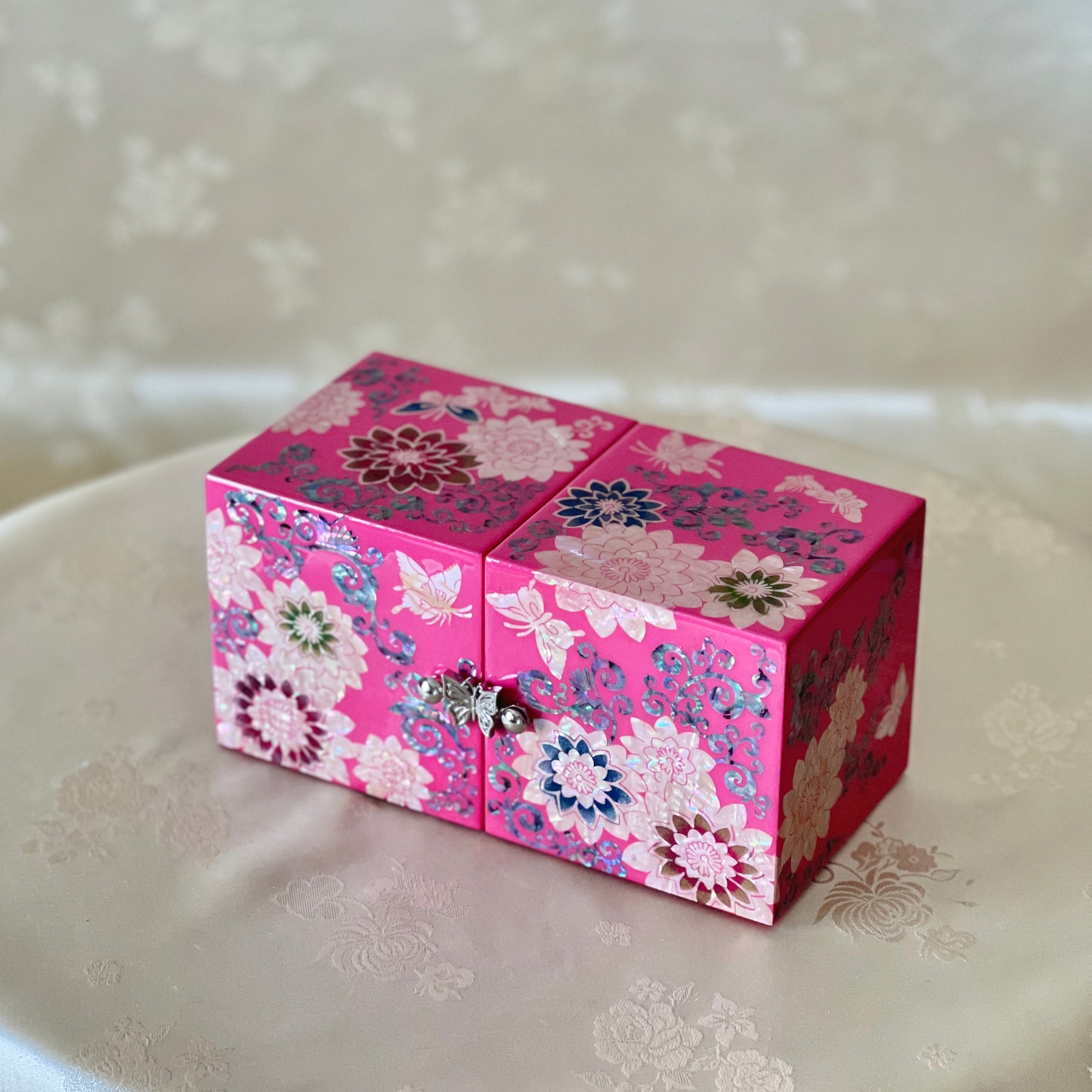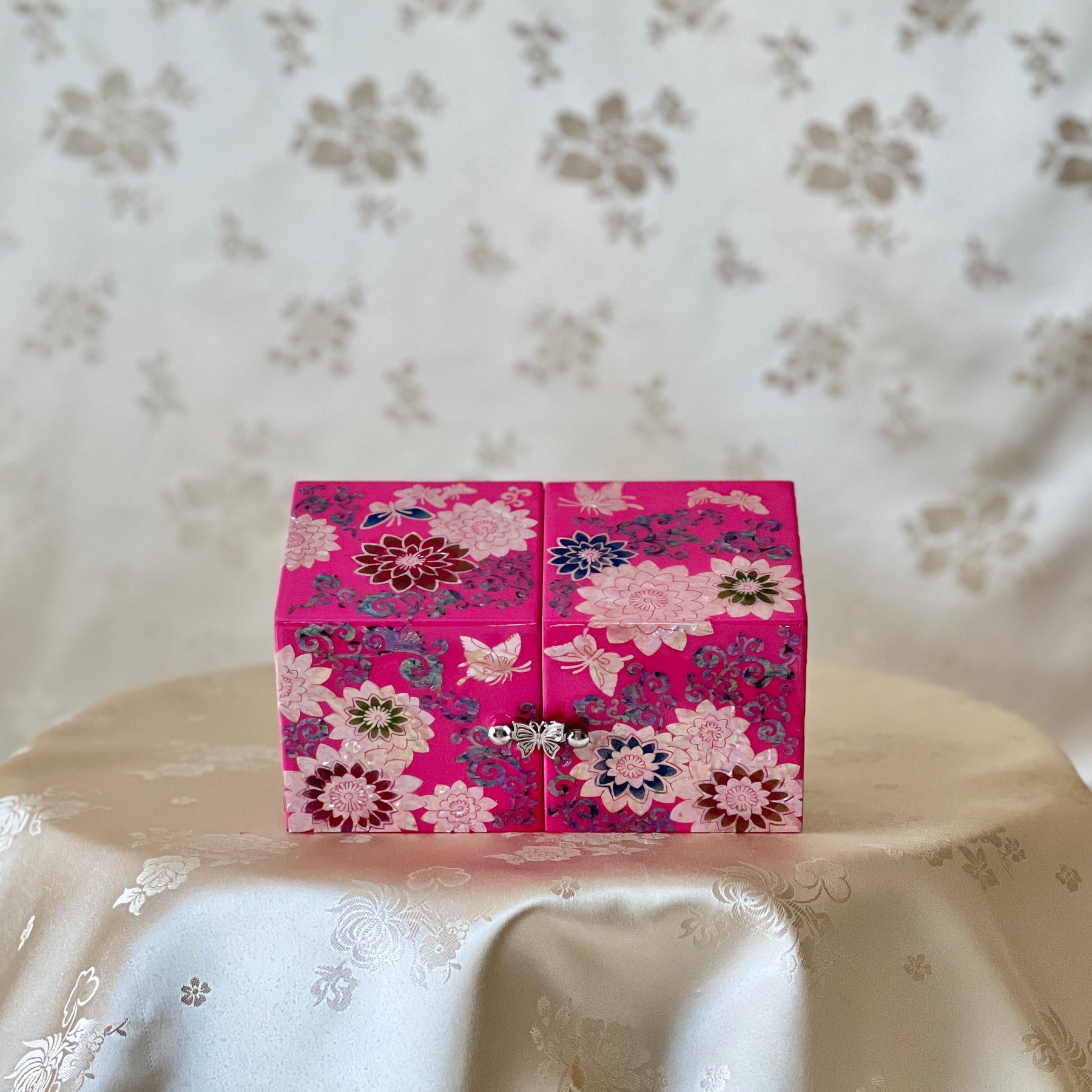 Entdecken Sie den Inbegriff von Eleganz mit der sorgfältig gefertigten traditionellen koreanischen Schmuckschatulle (자개 호접 국화문 쌍합).