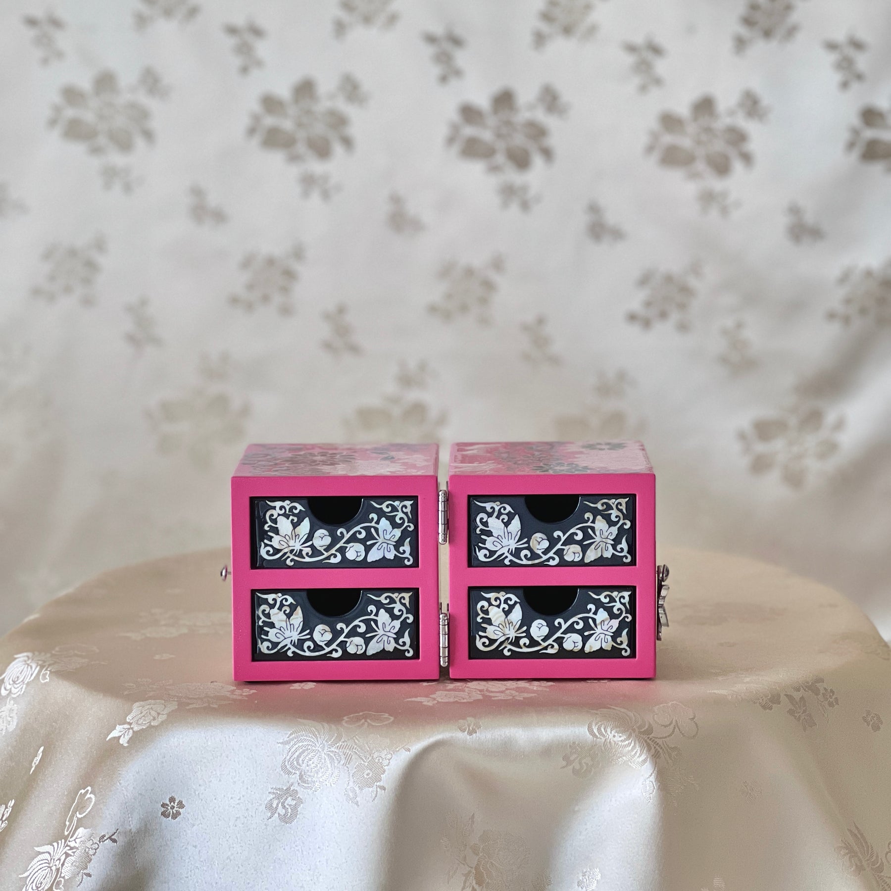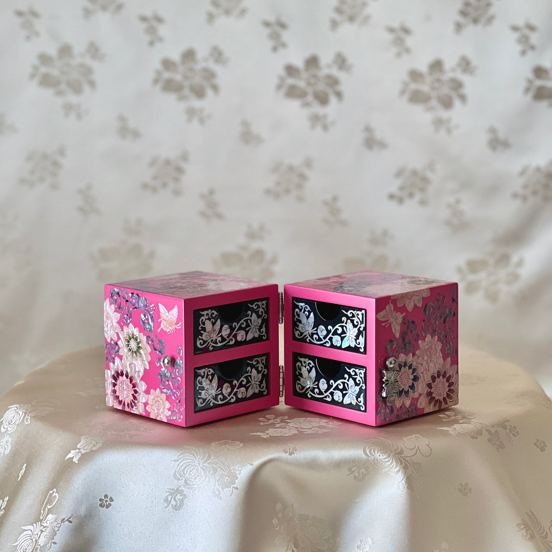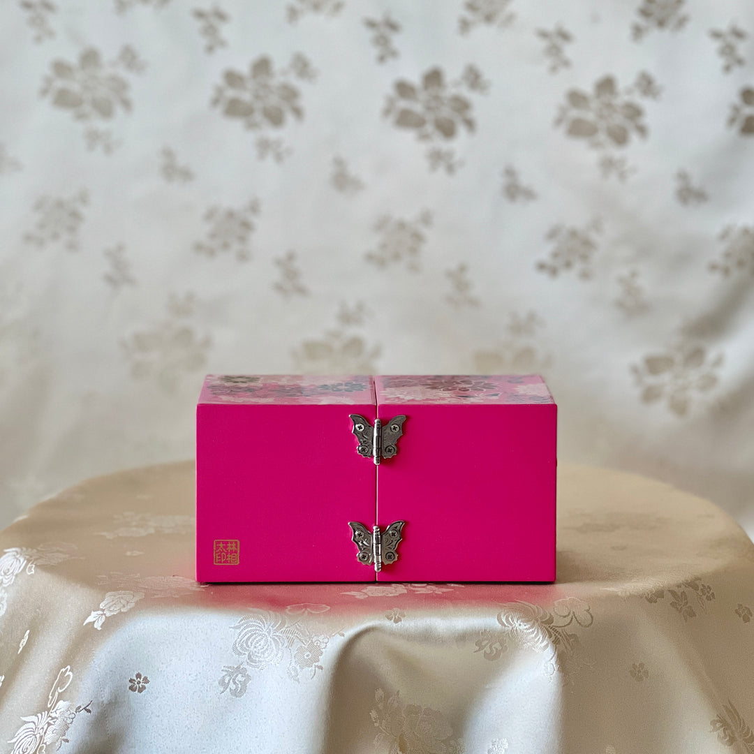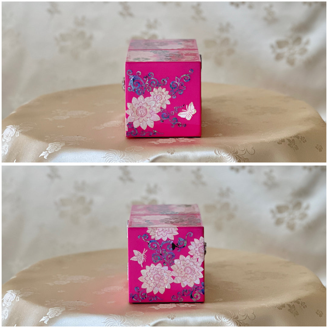 Entdecken Sie den Inbegriff von Eleganz mit der sorgfältig gefertigten traditionellen koreanischen Schmuckschatulle (자개 호접 국화문 쌍합).