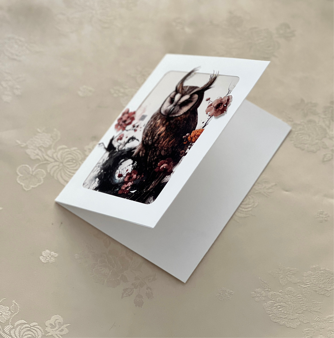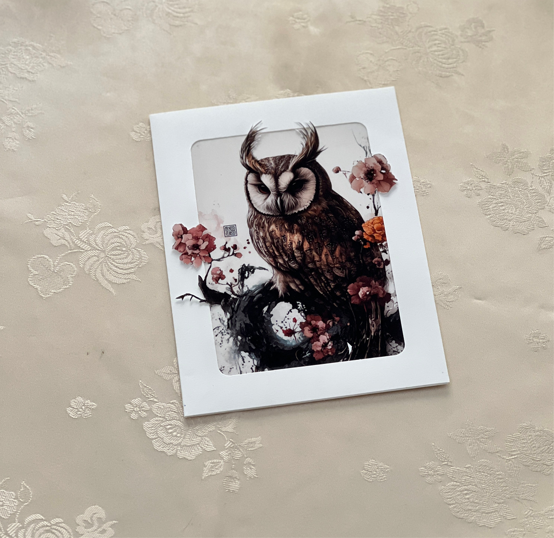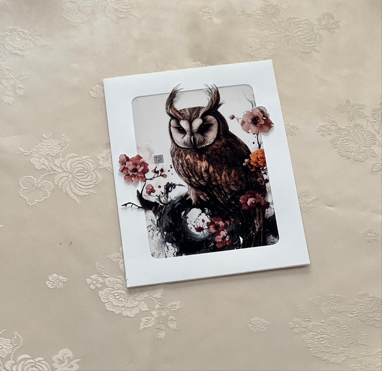 Postkarte im koreanischen Stil mit Malerei und Geschichte – Eule gwi
