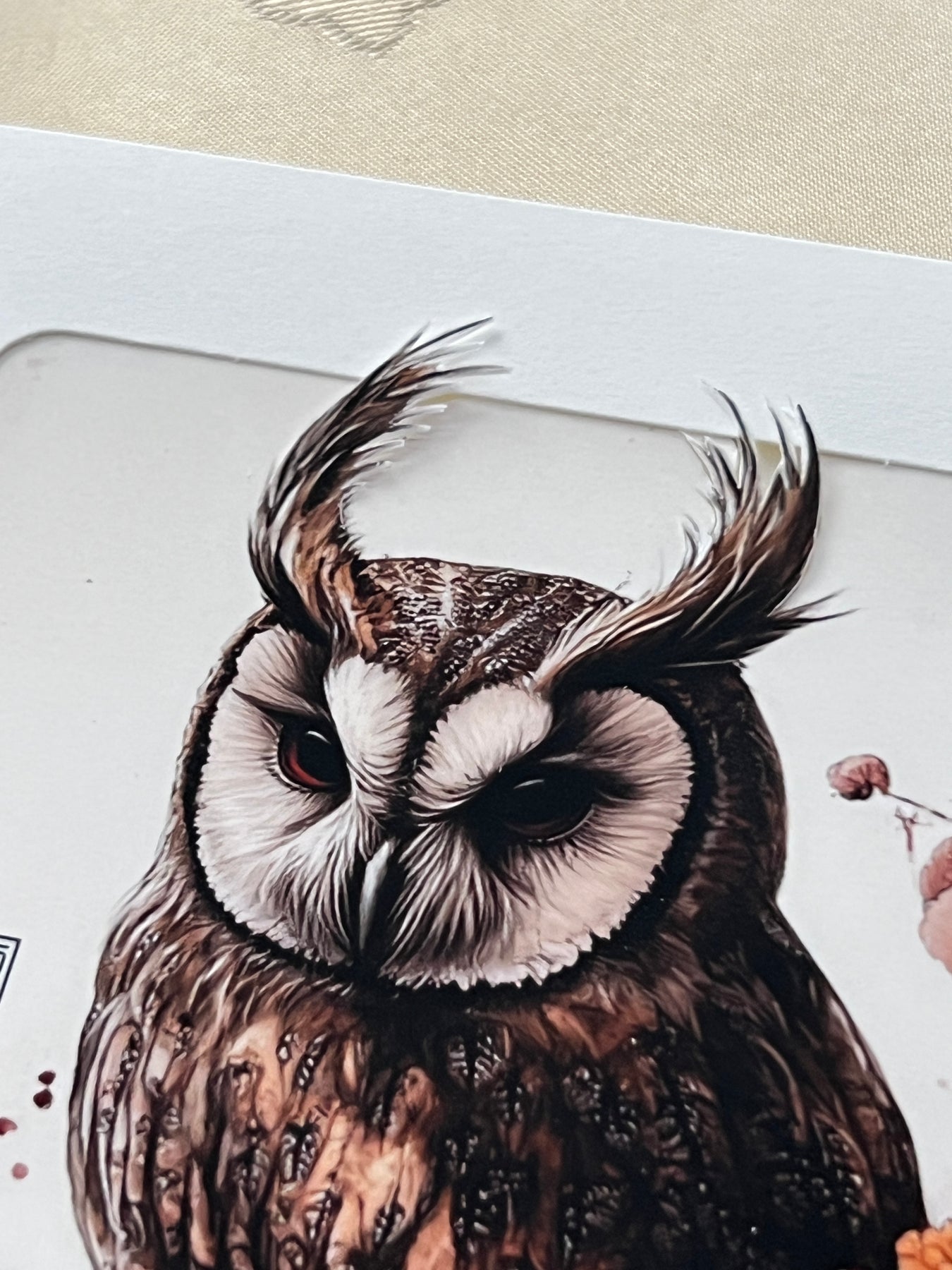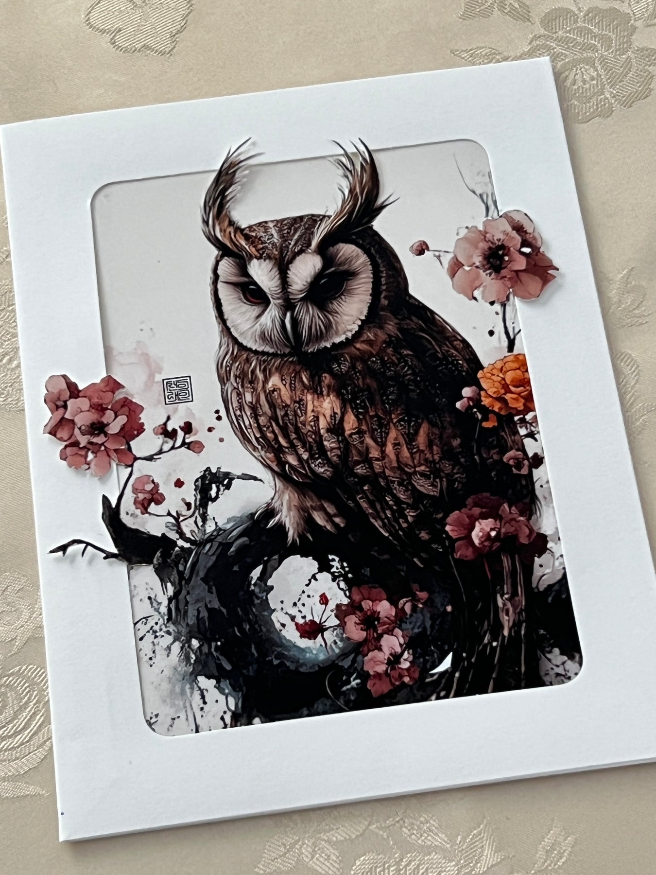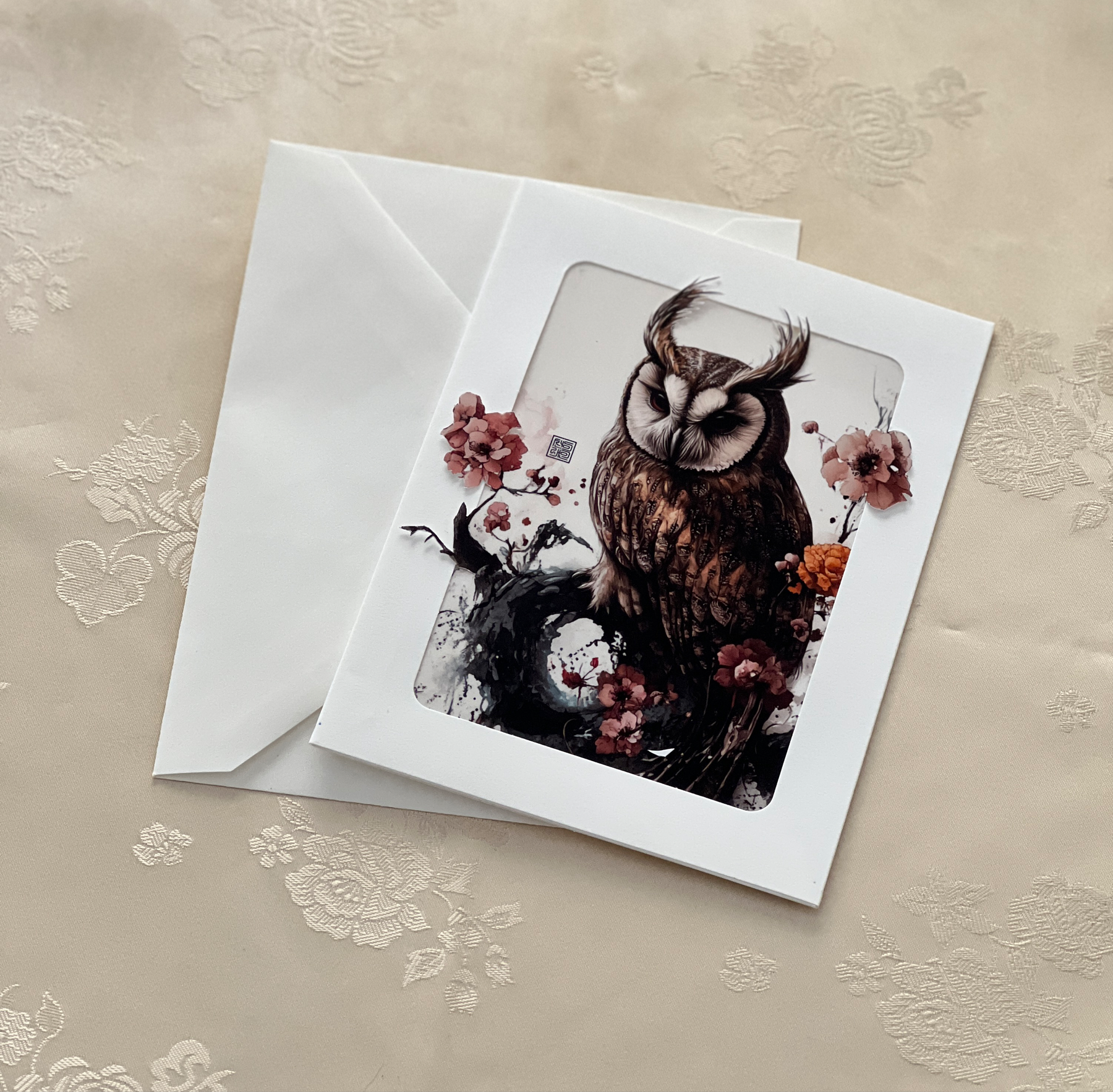 Postkarte im koreanischen Stil mit Malerei und Geschichte – Eule gwi