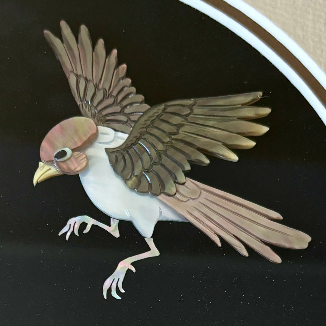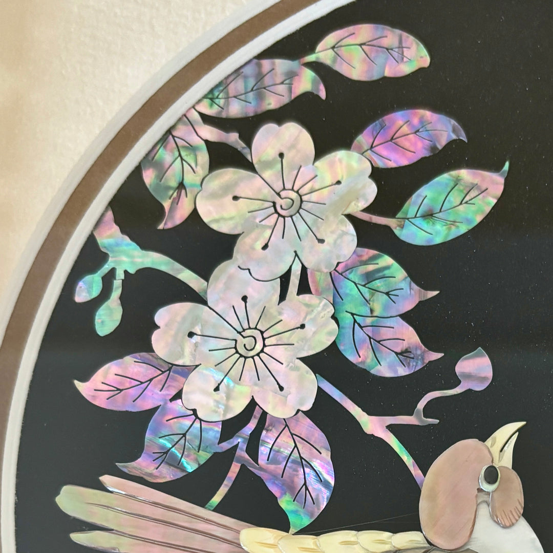 Perlmutt-Kunstwerk in quadratischem Rahmen mit Pflaumenblüten- und Vogeldesign in Originalschale