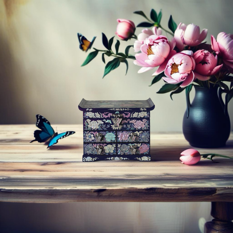 Entdecken Sie die zeitlose Eleganz dieser traditionellen koreanischen handgefertigten Perlmutt-Schmuckschatulle (자개 호접 목단문 선비 설합 보석함), die mit einem bezaubernden Schmetterlings- und Pfingstrosenmuster verziert ist. Dieses exquisite Stück verbindet traditionelle Kunstfertigkeit mit moderner Ästhetik und ist damit eine herausragende Ergänzung für jede Sammlung.