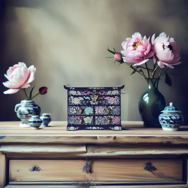 Diese Schmuckschatulle weicht von den traditionellen Perlmutttönen Schwarz oder Rot ab und ist dank ihrer modernen Kobaltfarbe ein perfektes Geschenk für Hochzeiten, Jubiläen oder andere besondere Anlässe. Die harmonische Mischung aus Schmetterlings- und Pfingstrosenmustern verleiht einen Hauch zeitloser Schönheit und Eleganz.