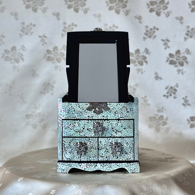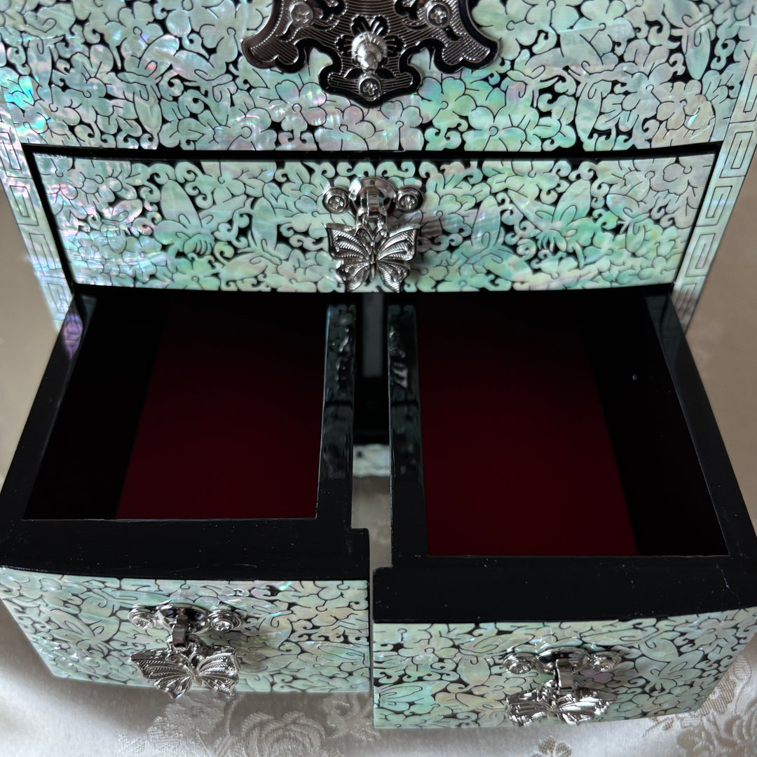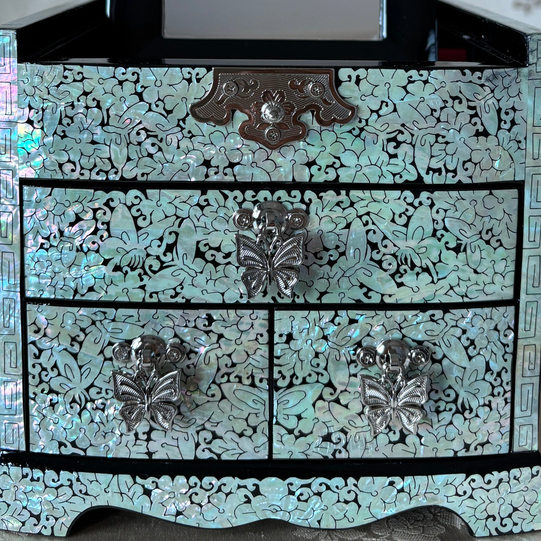 Die sorgfältig aus glänzendem Perlmutt gefertigten Blumen- und Schmetterlingseinlagen schimmern im Licht und vermitteln ein Gefühl von Ruhe und zeitloser Eleganz. Jedes winzige Fragment ist präzise platziert, sodass keine zwei Schmuckkästchen genau gleich sind – ein einzigartiger Schatz, den man in Ehren halten möchte.