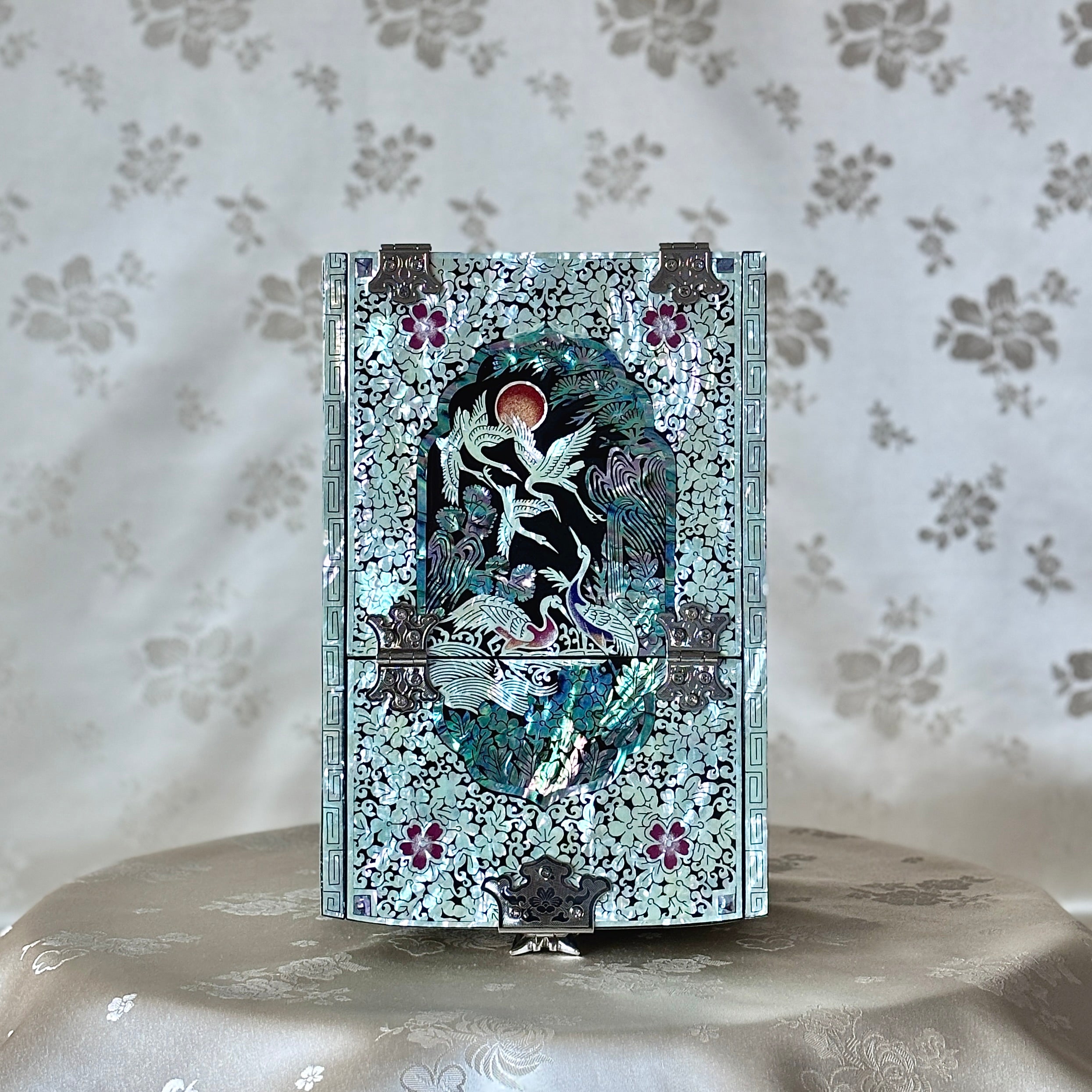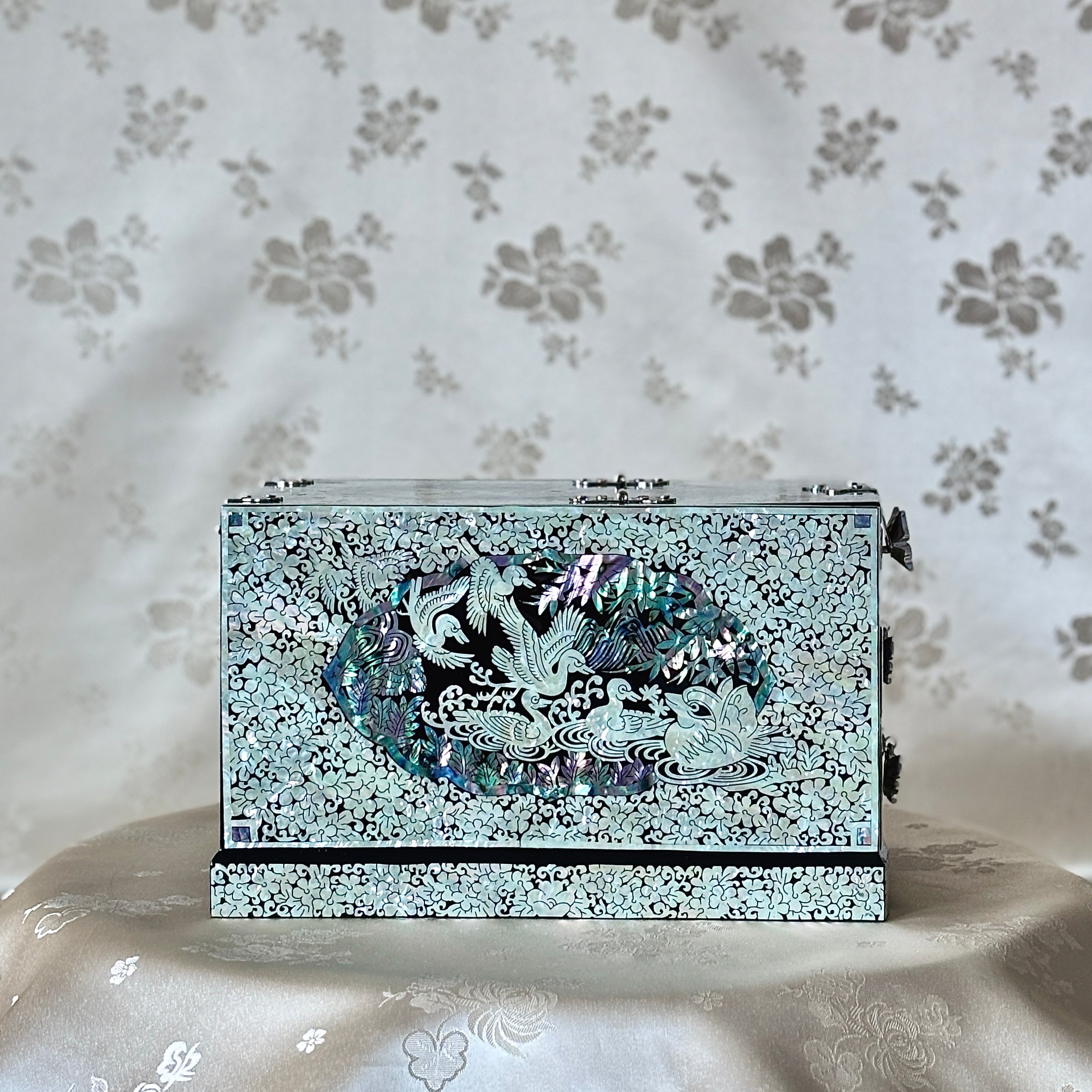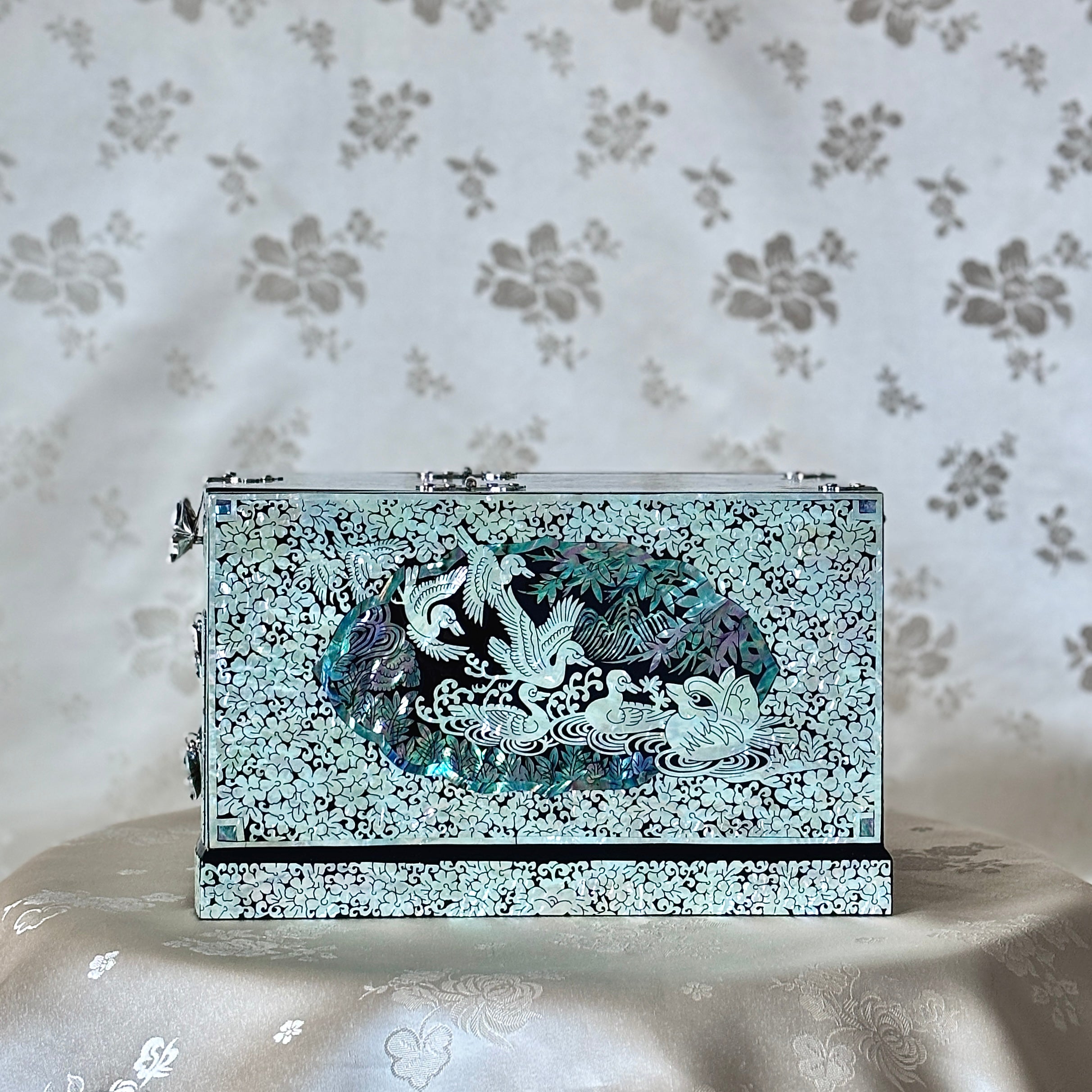 Diese exquisite Schmuckschatulle aus Perlmutt ist ein wahrer Beweis für die Schönheit des koreanischen Erbes. Verziert mit filigranen Kranich- und Mandarinenten-Motiven spiegelt sie Langlebigkeit, Liebe und Harmonie wider. Kraniche, die anmutig unter der Sonne schweben, verkörpern Weisheit und ein langes, erfülltes Leben, während Mandarinenten unerschütterliche Hingabe und eheliches Glück repräsentieren.