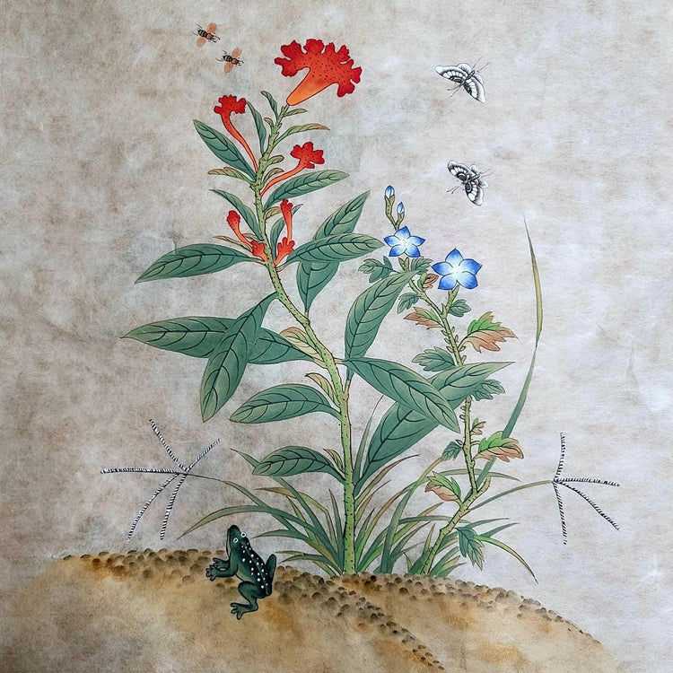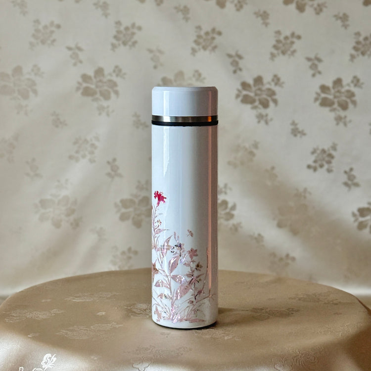Das komplizierte Muster auf dieser Thermosflasche zeigt Celosia Cristata und einen Frosch, inspiriert von der berühmten koreanischen Künstlerin Shin Saimdang, einer Frau aus der Joseon-Ära. Dieses Design ist Teil ihrer berühmten Gemäldeserie „Pflanzen und Insekten (chochungdo, 초충도)“, die auf einem 8-teiligen Paravent dargestellt ist. Das Kunstwerk fängt auf wunderschöne Weise die Harmonie zwischen Natur und Kunst ein und macht diese Flasche zu einem einzigartigen und bedeutungsvollen Accessoire.