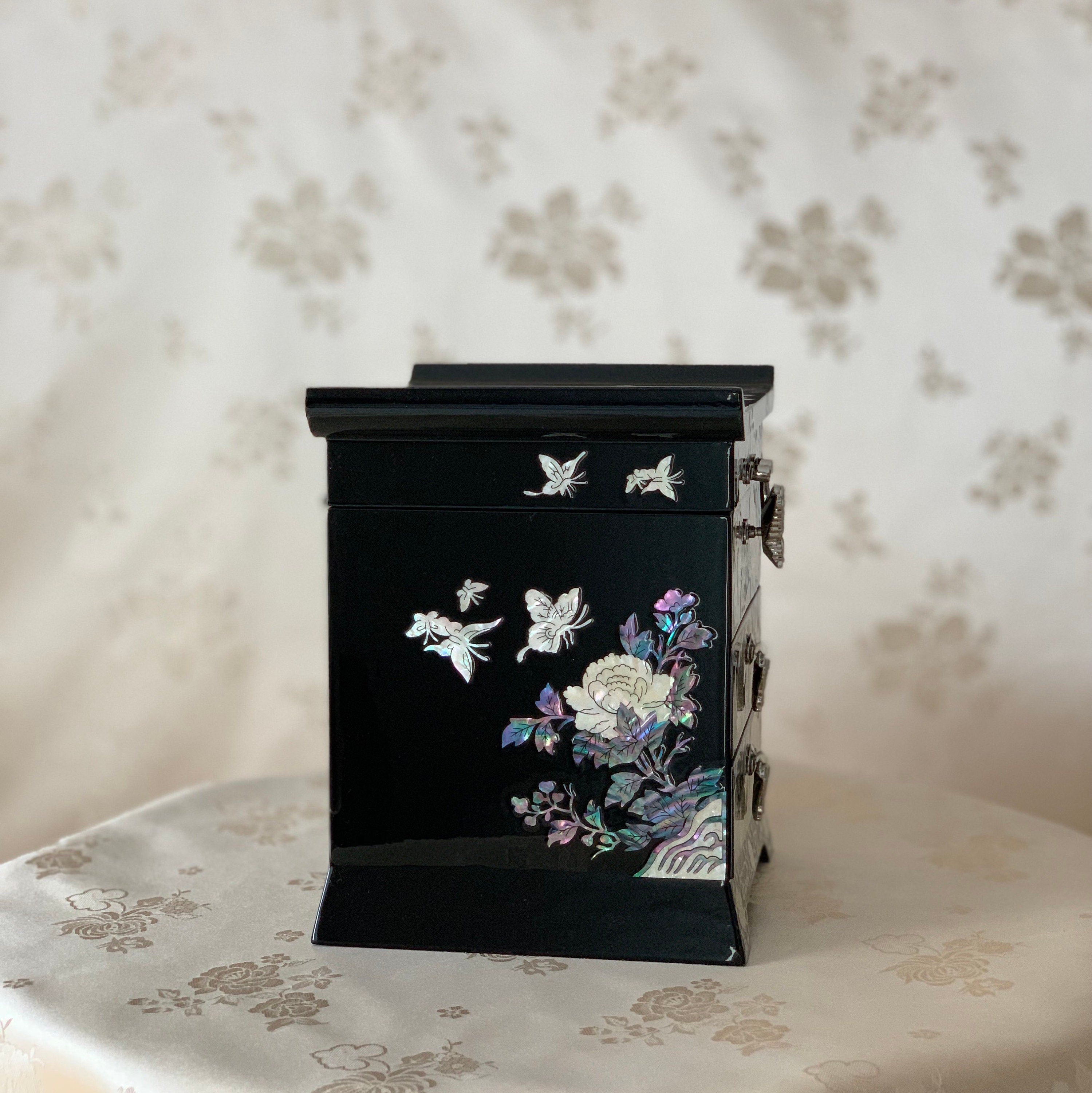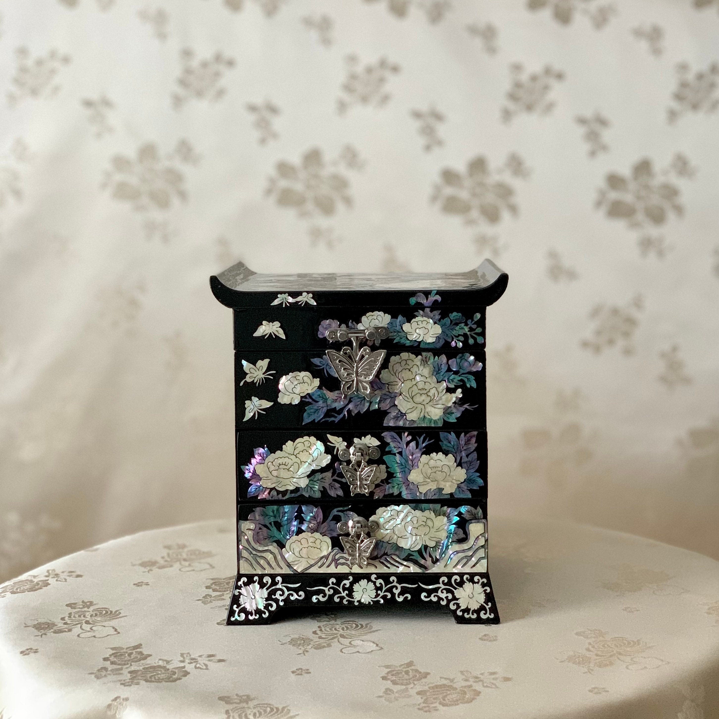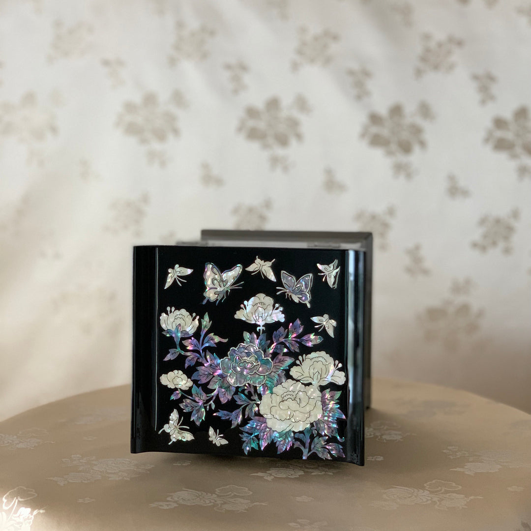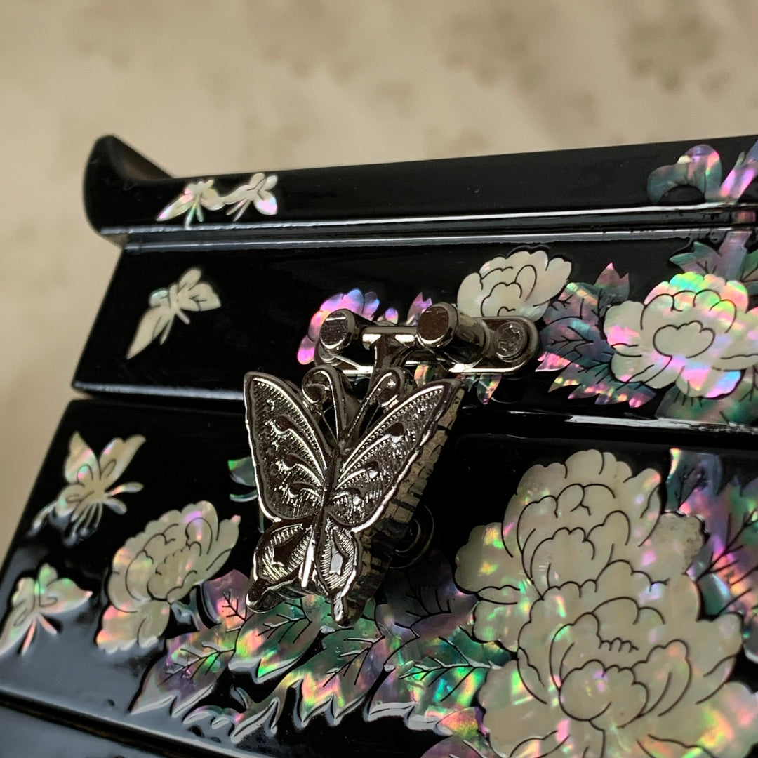 Schwarze Schmuckschatulle aus Perlmutt mit Schmetterlings- und Pfingstrosenmuster (자개 호접 목단문 선비 보석함)