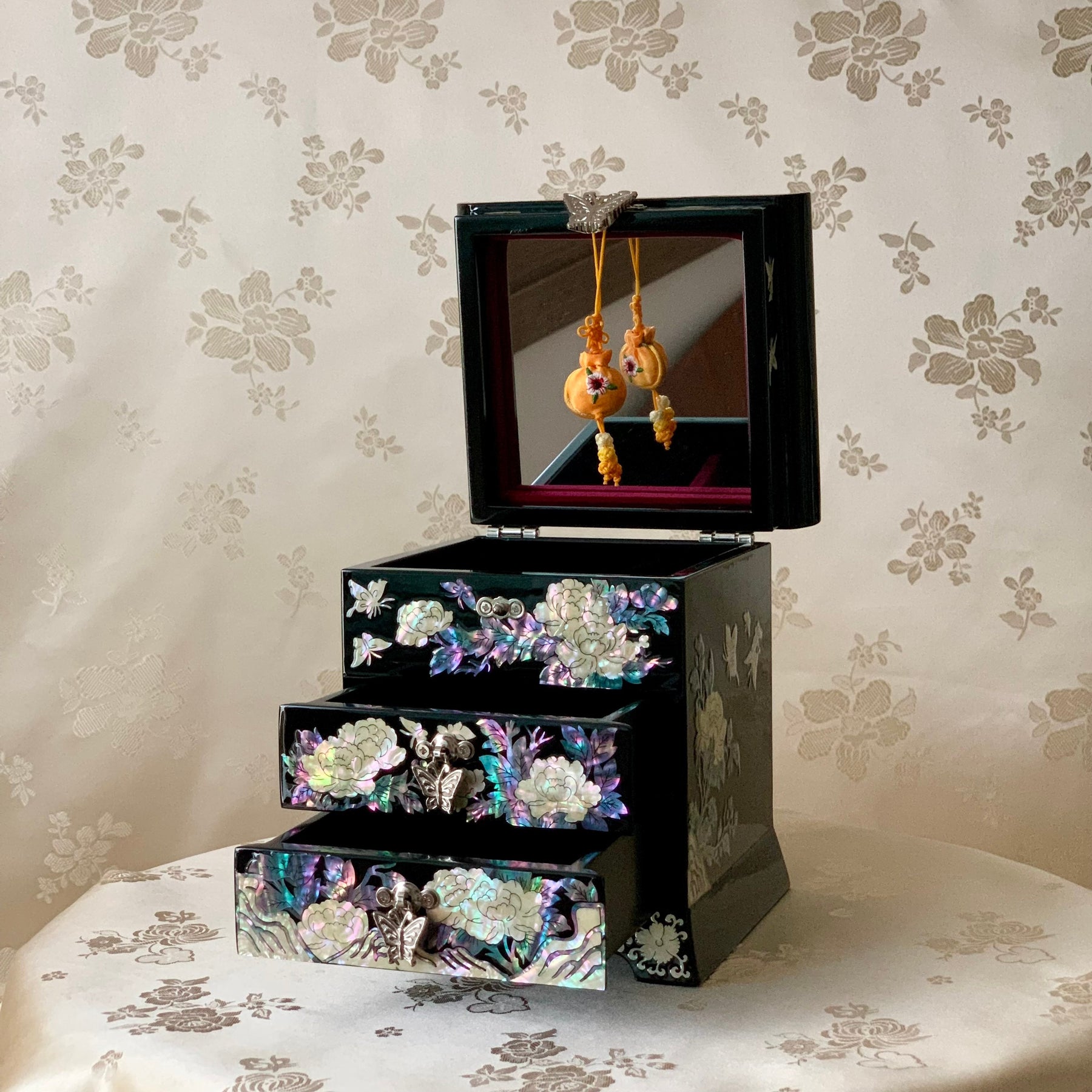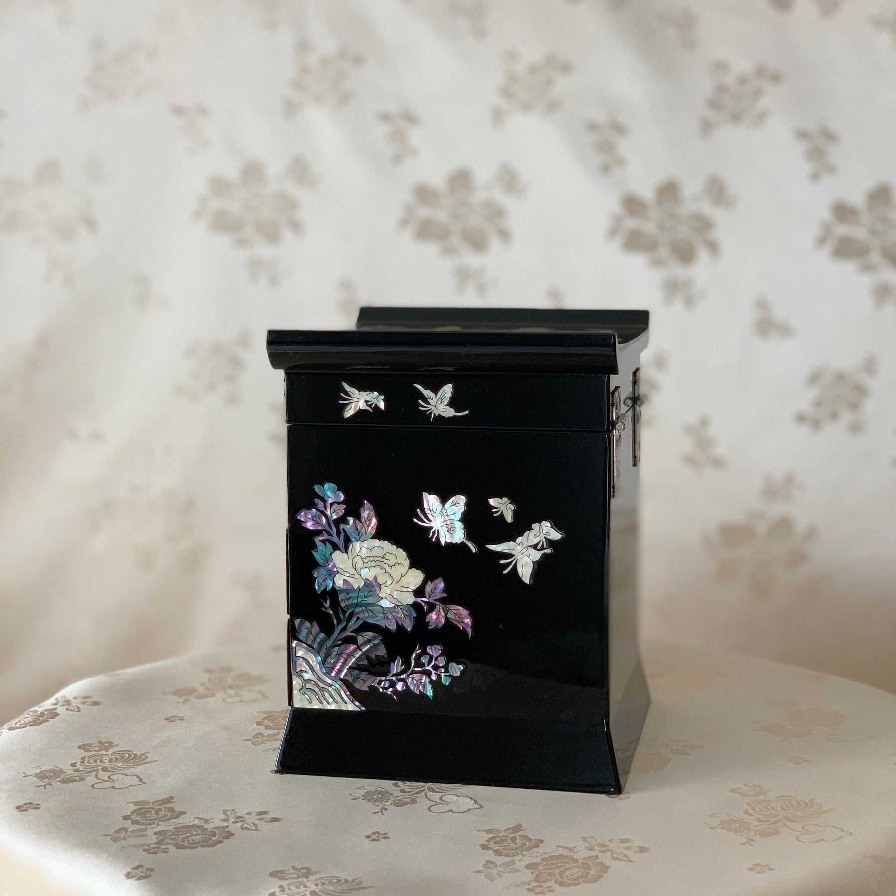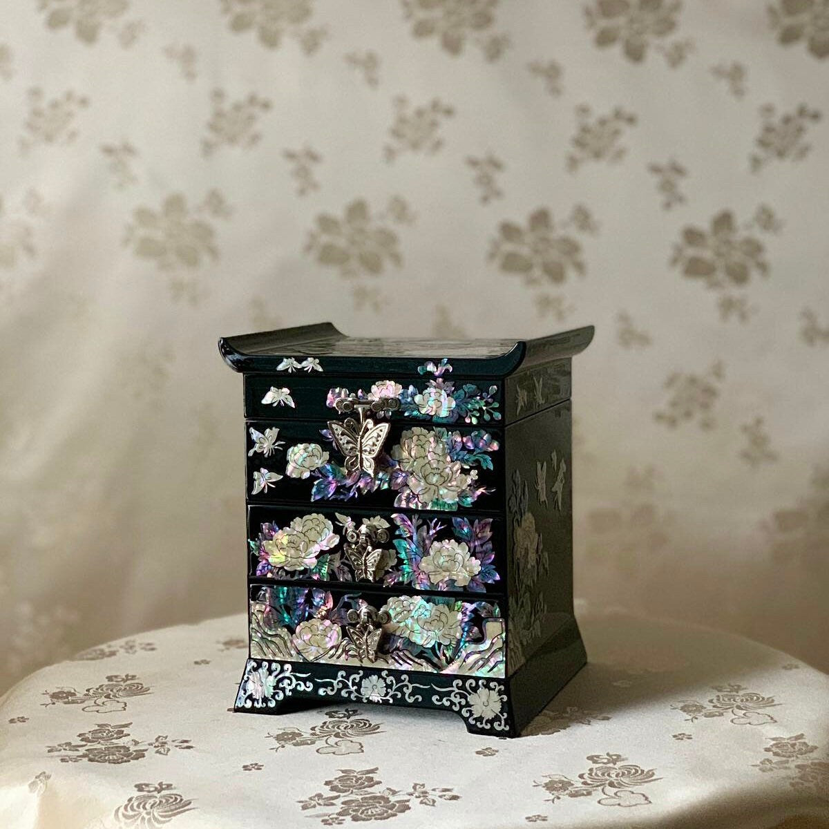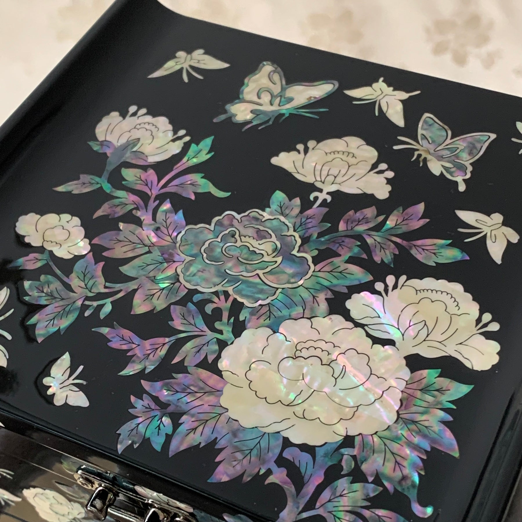 Schwarze Schmuckschatulle aus Perlmutt mit Schmetterlings- und Pfingstrosenmuster (자개 호접 목단문 선비 보석함)