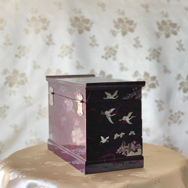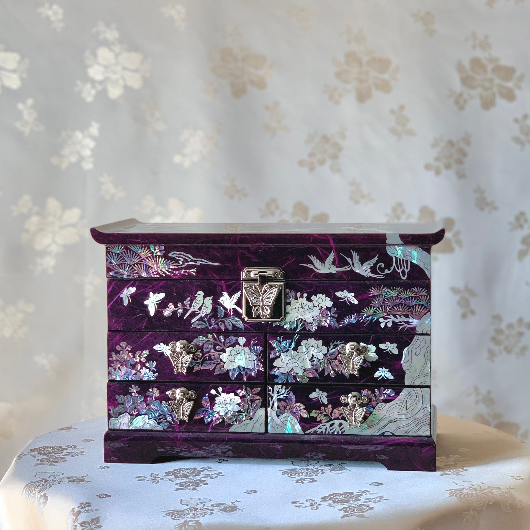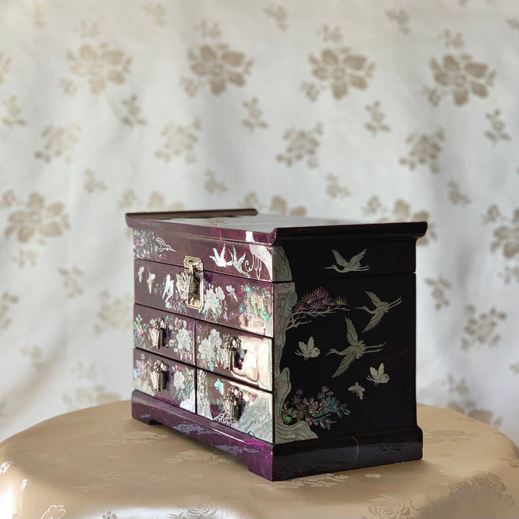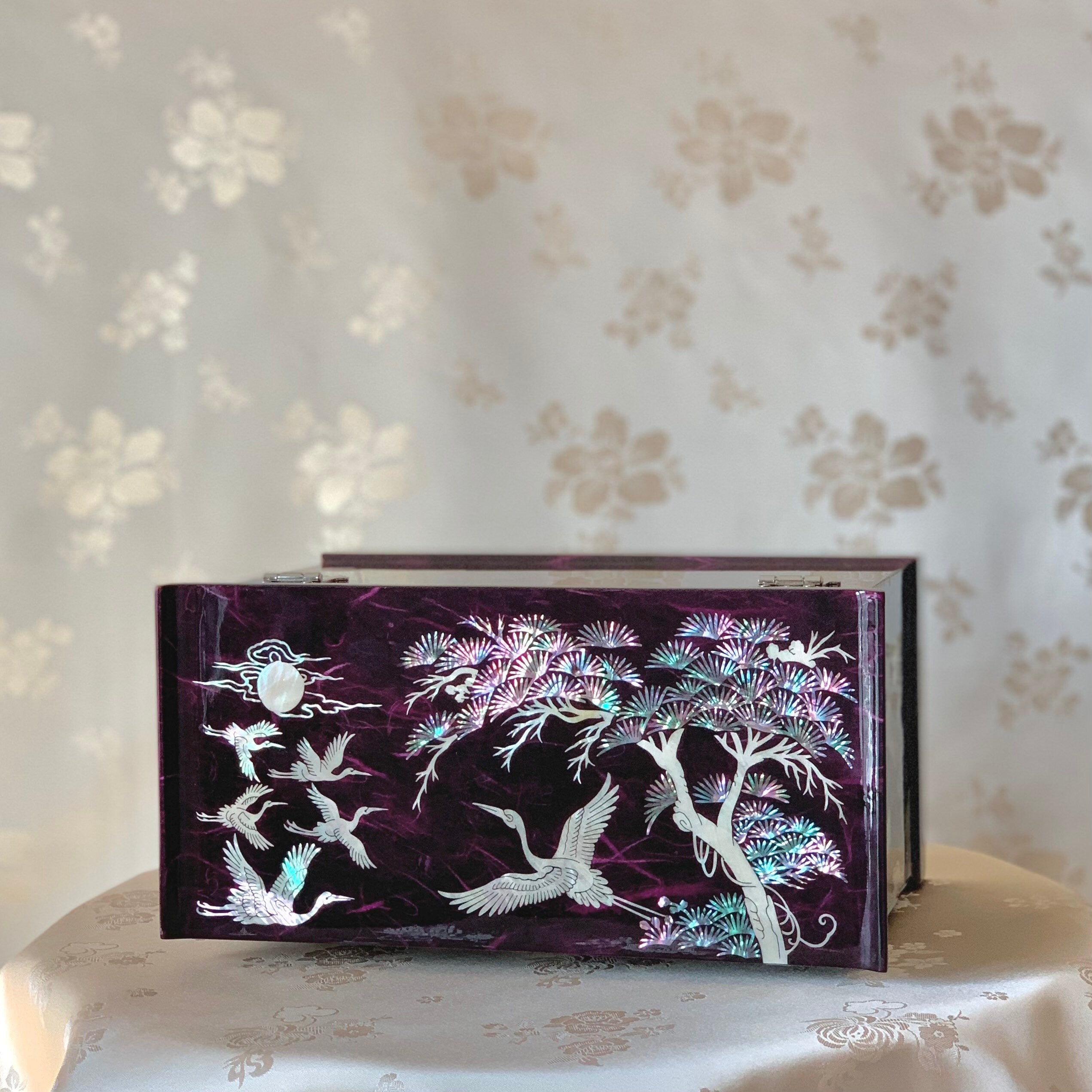 Schmuckschatulle aus perlmuttviolettem Papier mit Kranich- und Kiefernmuster (자개 송학문 선비 보석함)