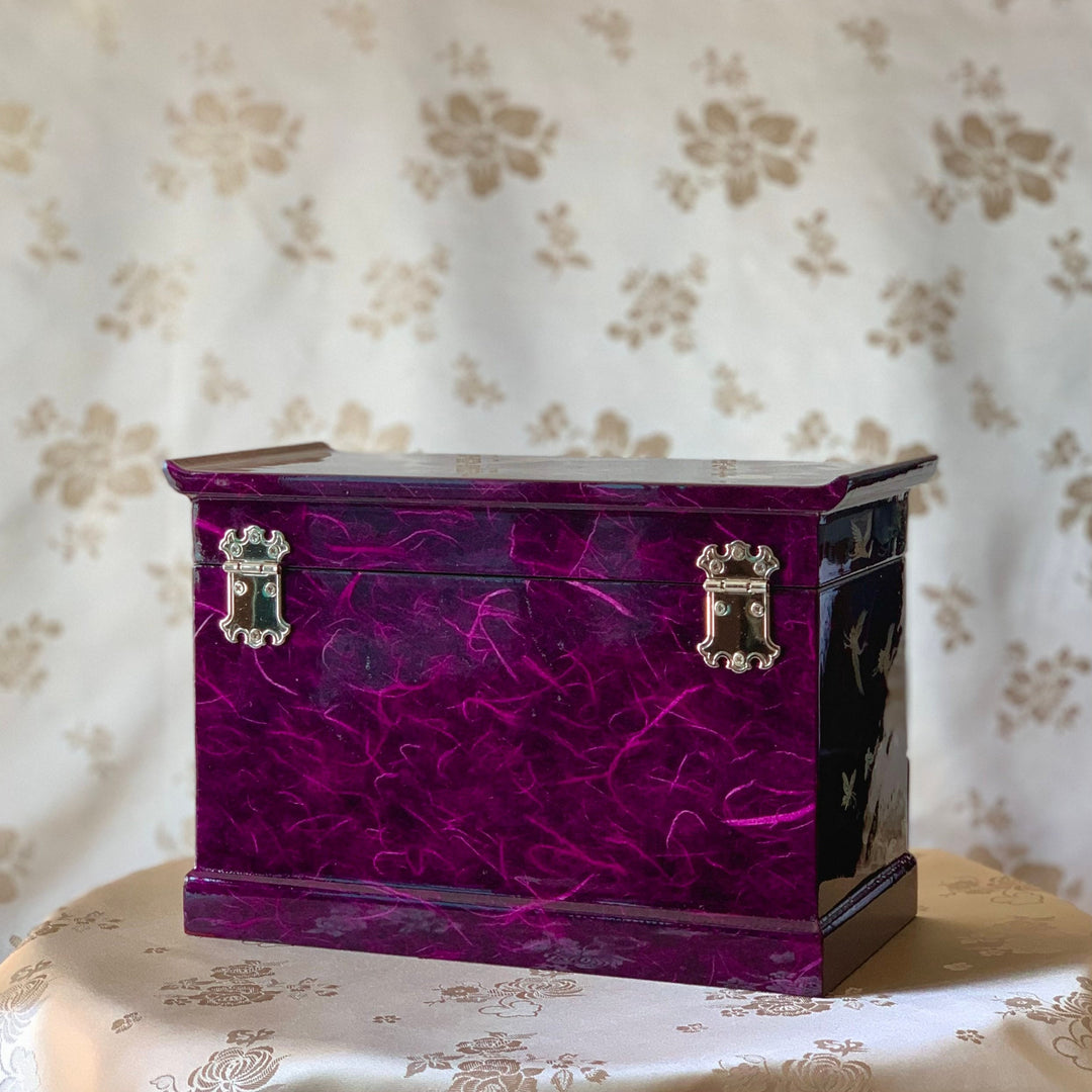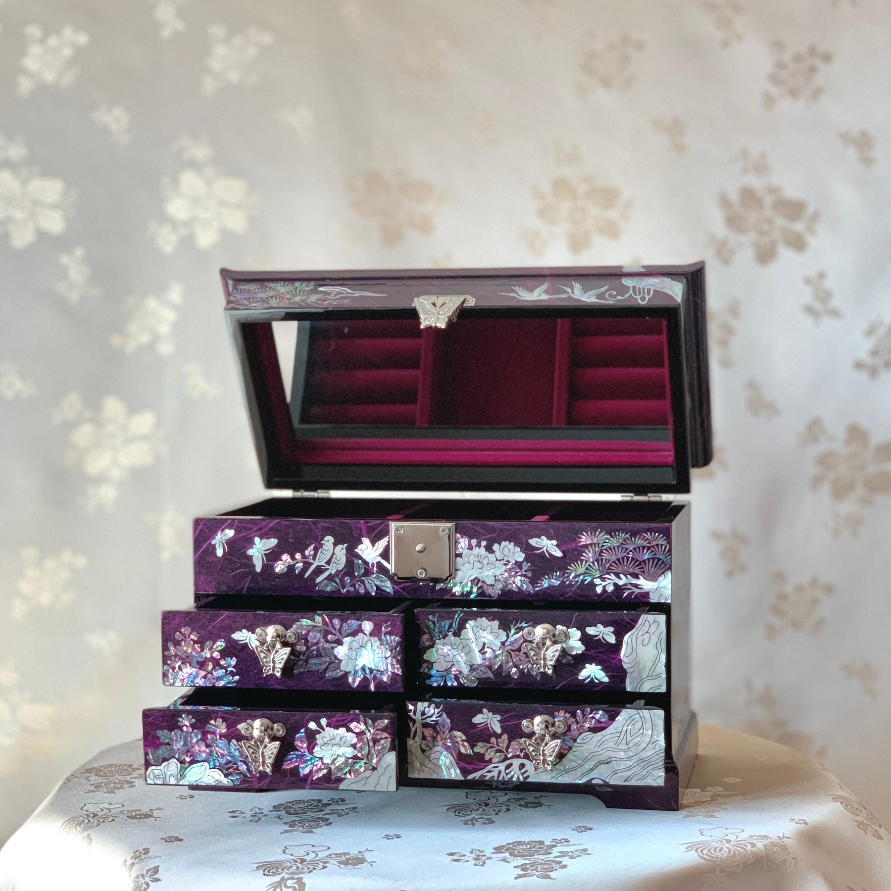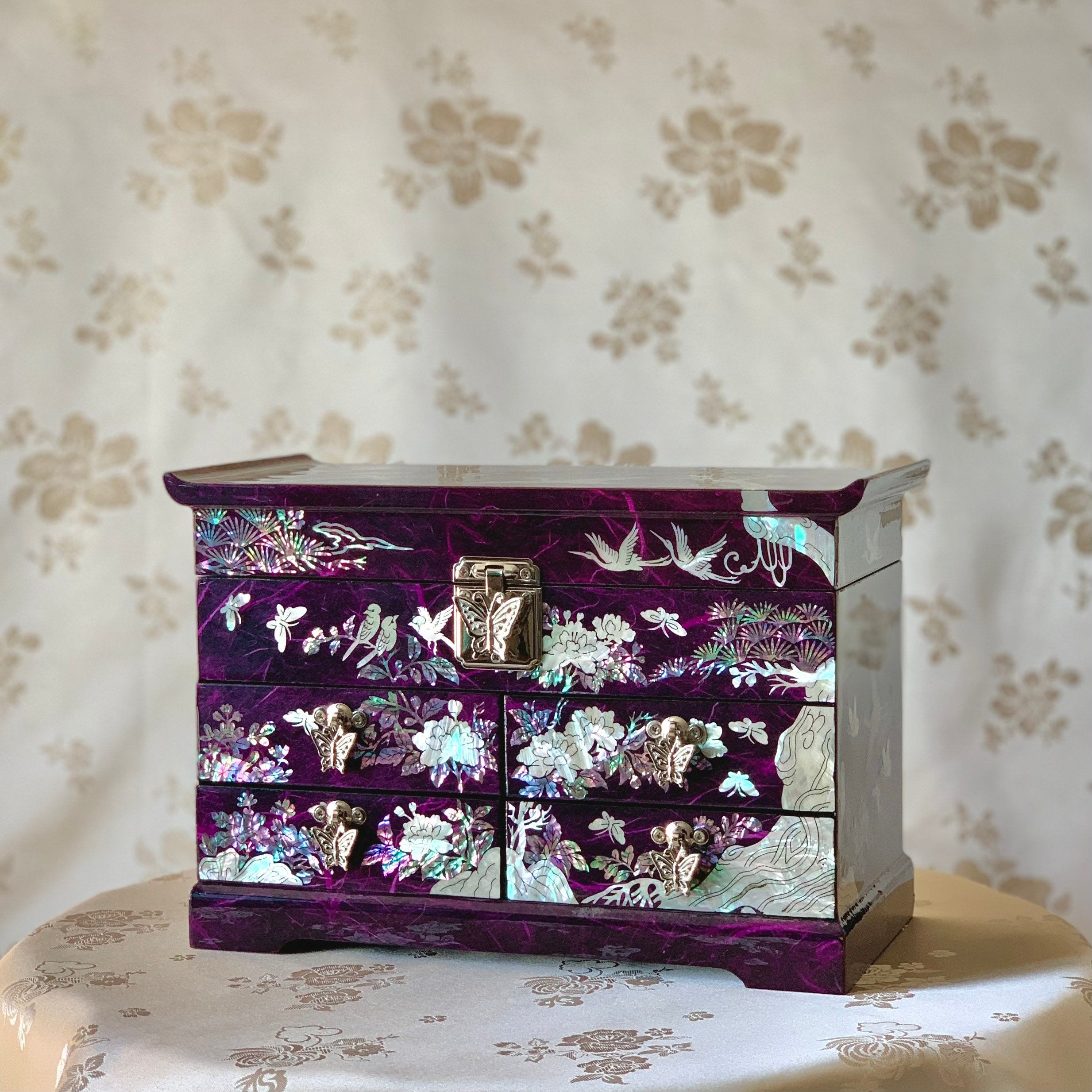 Schmuckschatulle aus perlmuttviolettem Papier mit Kranich- und Kiefernmuster (자개 송학문 선비 보석함)