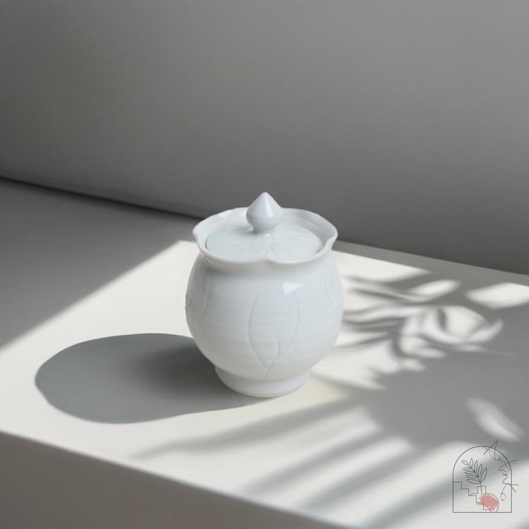 Weiße Teedose aus Porzellan mit Lotusblatt-Design