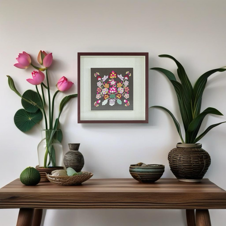 Celebrate the elegance of Korean tradition with this stunning Big Size Handmade Craft Embroidery featuring a potted lotus pattern, beautifully framed in wood (자수 연화 분경문 액자). Historically, Koreans cherished the beauty of potted plants, known as “bungyeong” (분경). The lotus, a plant with deep cultural significance, symbolizes purity and enlightenment.