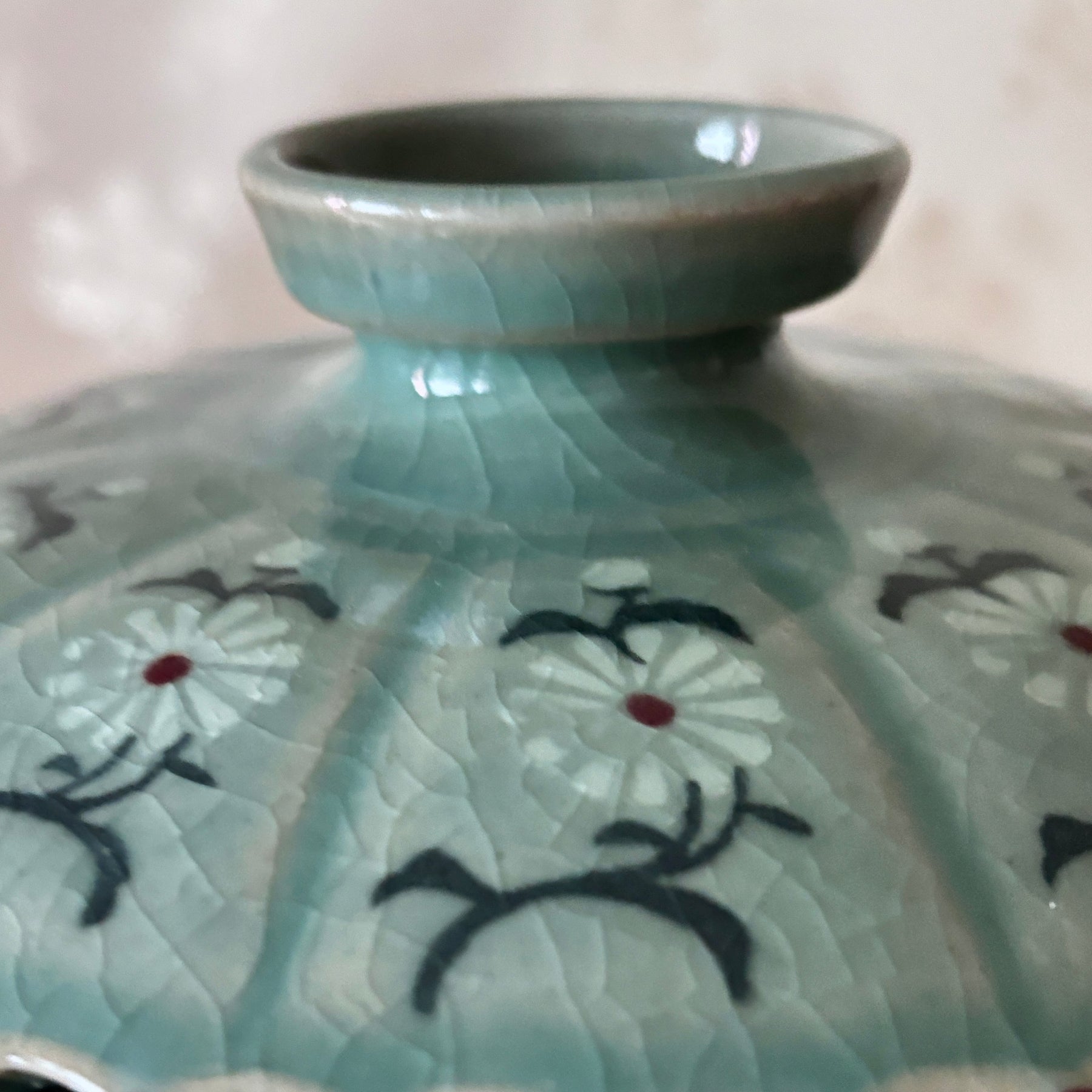 Above and below the pierced body, inlaid chrysanthemum motifs are carefully applied using the traditional sanggam technique. The blossoms, timeless symbols of dignity and renewal, are contrasted with the airy openness of the openwork, bringing the vase into a harmonious balance between intricacy and repose.
