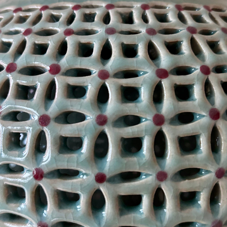 The surface feels as alive as it looks—a field of miniature sculptures where light drifts through the openwork and settles softly into shadow. Between the lattices, chilbo-inspired crimson dots are rendered evenly with red earth, adding a quiet vibrancy and depth to the serene celadon glaze.