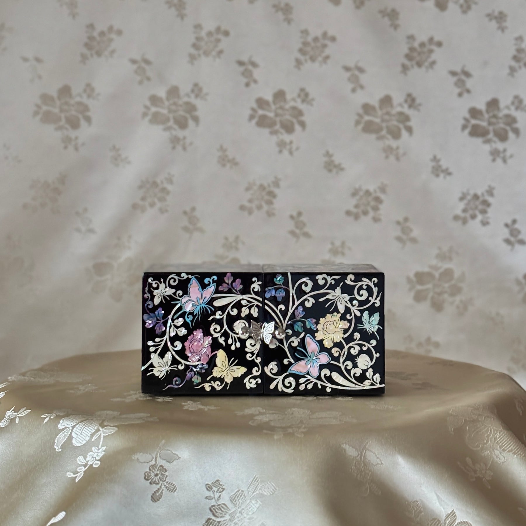 This double-layered jewelry chest is a quiet celebration of elegance, memory, and craftsmanship. Cloaked in a deep black surface, its panels shimmer with meticulously inlaid butterfly and arabesque (dangcho) vine motifs — each piece of mother-of-pearl catching the light with a different tone, like reflections that shift with time and mood.