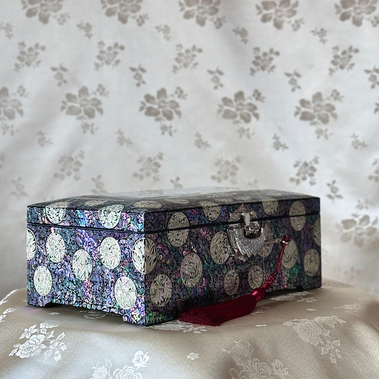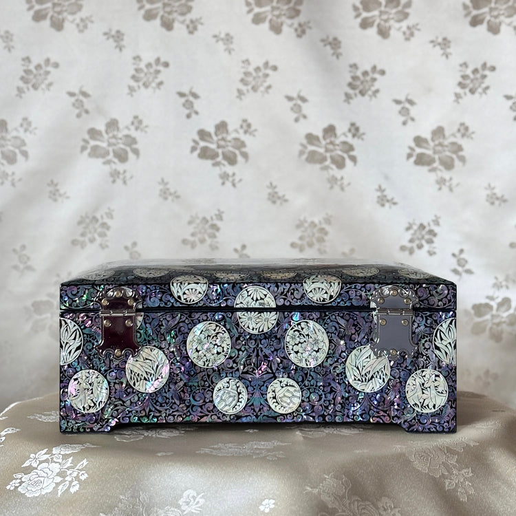 This exquisite jewellery box, crafted by mother-of-pearl artist Park In-Ho, is adorned on every visible surface—except the base—with meticulously arranged shell pieces that shift in colour with the light. Its appearance changes gently from moment to moment, revealing new hues of violet, blue, and soft green as the viewer moves, creating the impression of a living artwork.