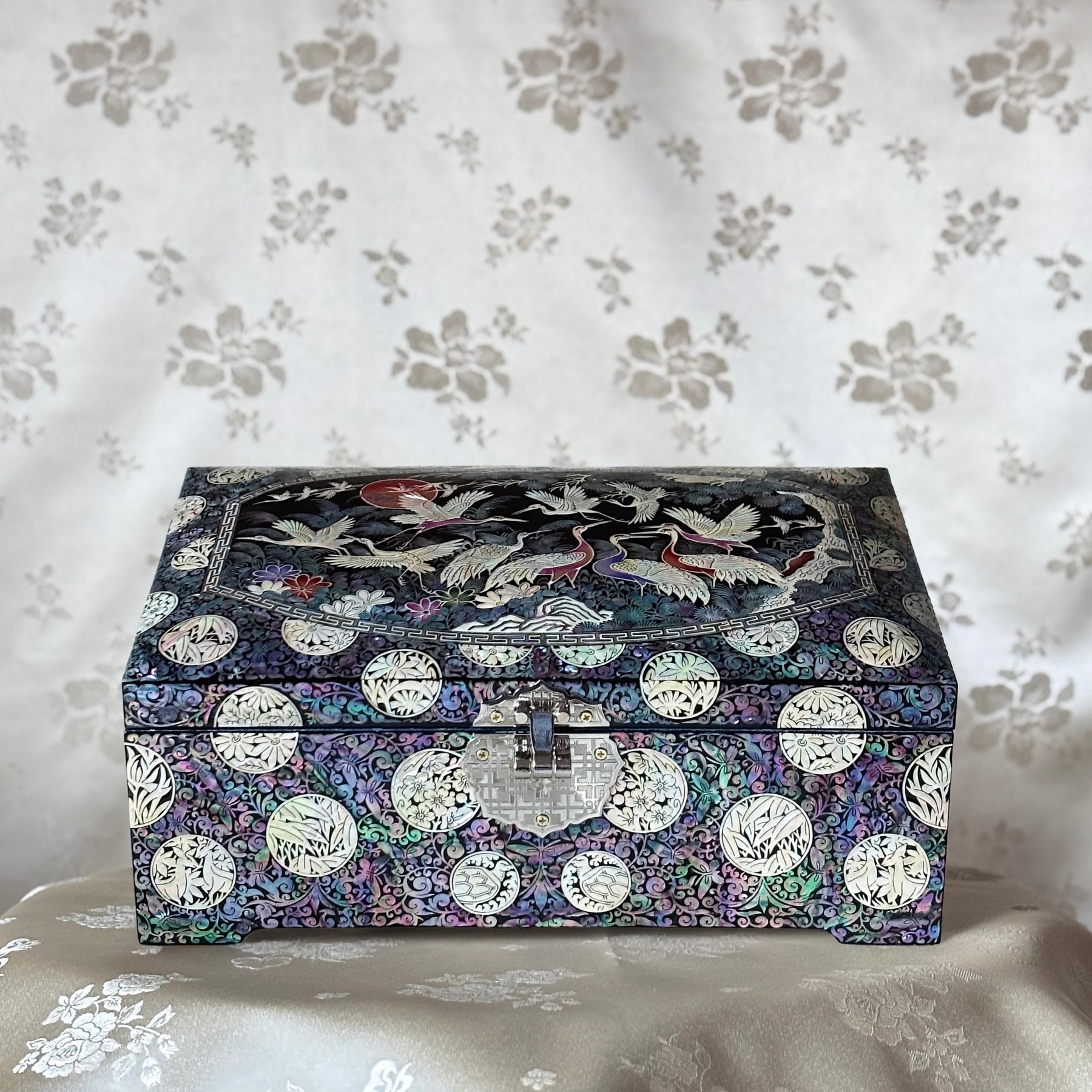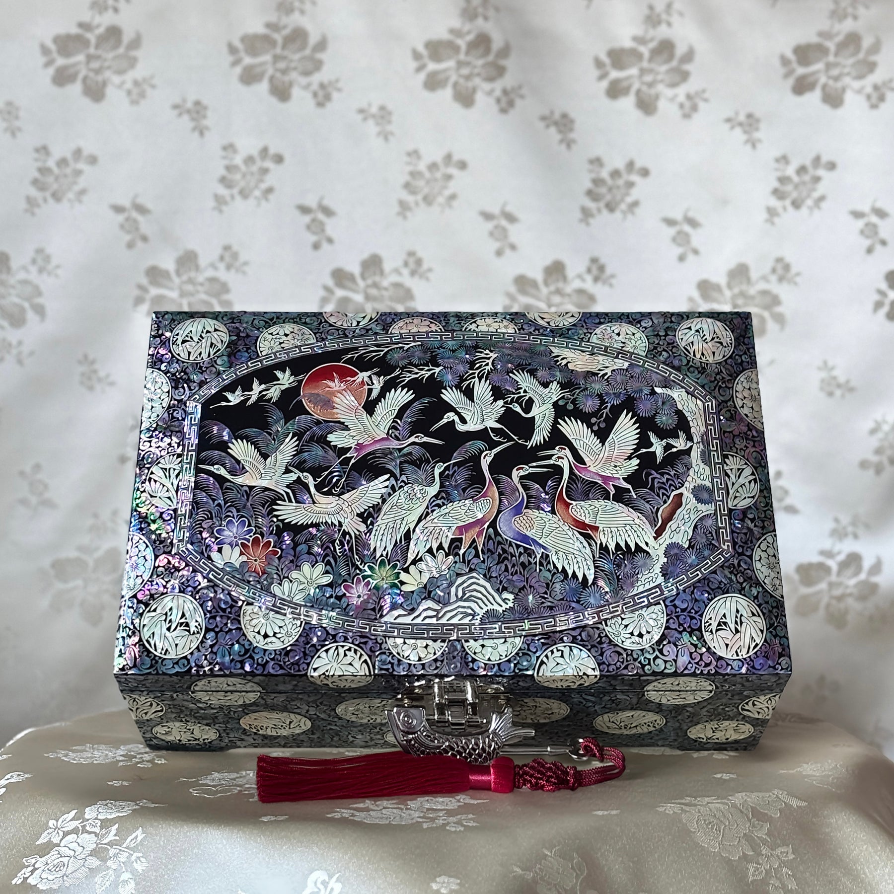 Mother-of-Pearl Jewelry Box: Crane Landscape with Longevity Symbols