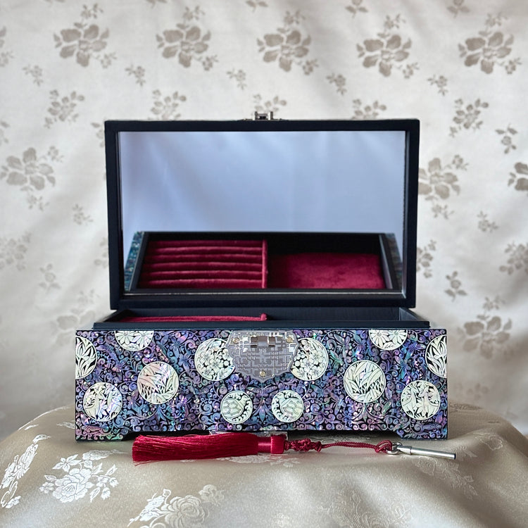 Opening the lid reveals a clear mirror, allowing the wearer to view jewellery as it is being placed. A removable velvet-lined tray provides elegant organisation for rings and earrings, its deep crimson tone adding warmth and contrast to the cool shimmering exterior. Lifting this tray reveals yet another surprise: the inner floor of the box is also decorated with mother-of-pearl, underscoring the maker’s commitment to refinement, even in hidden details.